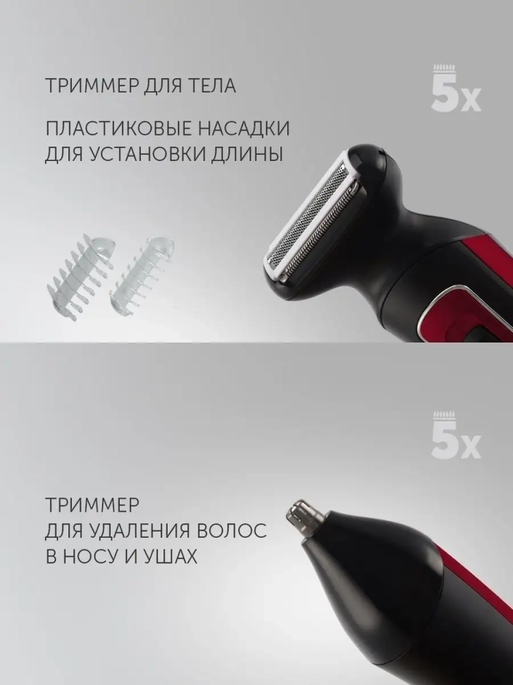 В комплекте 12 насадок и лезвий: 3 лезвия-триммера из высококачественной нержавеющей стали (триммер 5 мм для фигурных и детальных стрижек, узкий триммер 20 мм для бороды и широкий триммер 38 мм для стрижки волос), насадка-триммер для удаления волос в носу и ушах, насадка-триммер для тела, триммер для тела (мини-бритва) с насадками 2 и 4 мм, 4 насадки для широкого триммера (3, 6, 9 и 12 мм) и телескопическая насадка 5-8 мм для узкого триммера.