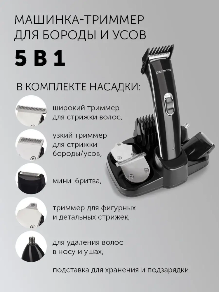 Триммерный набор Polaris PHC 3015RC 5в1 предназначен специально для создания аккуратных причесок, коррекции бороды и усов, а также для ухода за носом и ушами. Машинка-триммер может использоваться для тримминга, контуринга, дизайнерских стрижек, бритья, а также ухода за носом и ушами и обеспечивает ровное и комфортное бритье и стрижки без царапин и раздражений на коже лица.