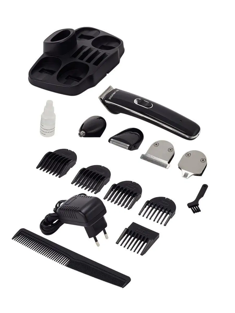 Электрическая машинка оснащена лезвиями из нержавеющей стали. В наборе 10 сменных насадок и лезвий, включая широкий и узкий триммеры для волос и бороды, триммер для фигурных стрижек, насадку-шейвер для бритья, насадку-триммер для удаления волос в носу и ушах, телескопическую насадку и 4 гребня от 3 до 12 мм. Минимальная длина стрижки – 0,5 мм. 8 установок длины стрижки 0,5 – 12мм позволяют делать разные стрижки. В комплекте также зарядная подставка для хранения и подзарядки, расческа, масло и щеточка.