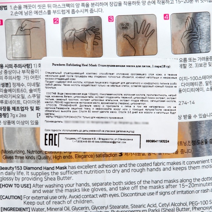 Способ применения: с маской, аккуратно разделите две перчатки и наденьте на руки. Оставьте на 20–25 минут. Аккуратно снимите перчатки и удалите салфеткой остатки средства. Завершите уход нанесением подходящего крема