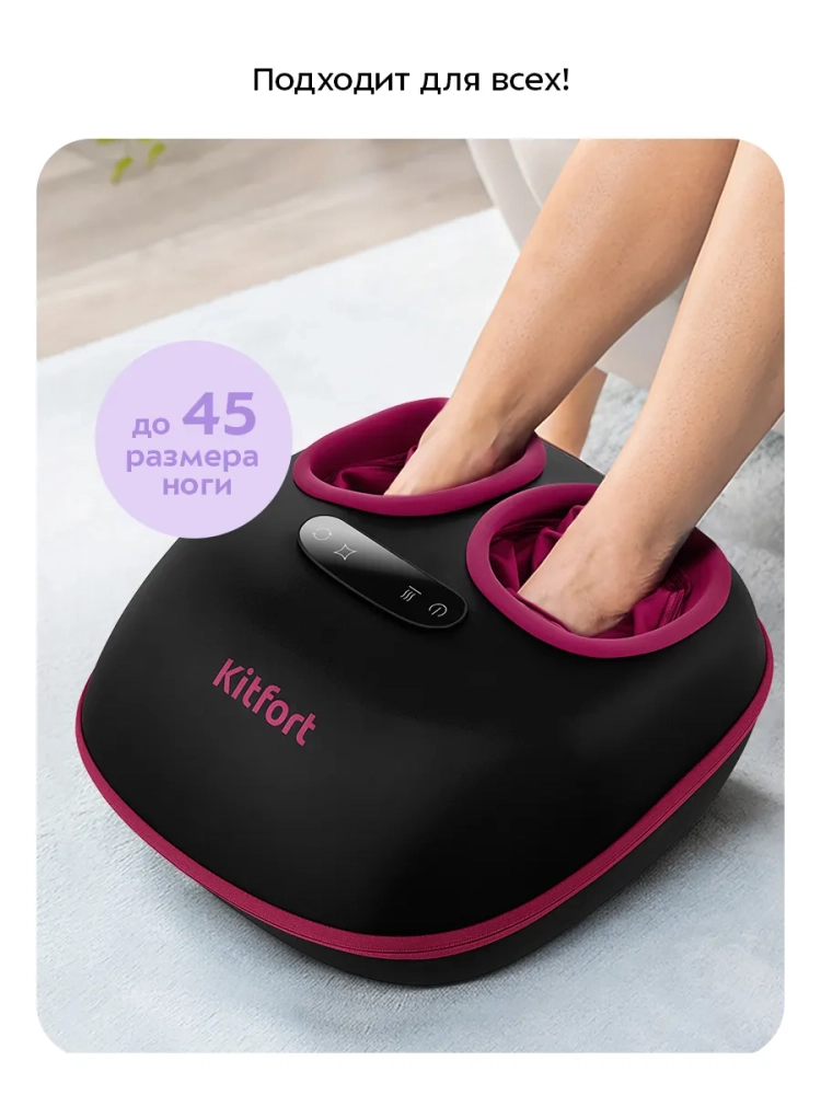 Массажер для ног Kitfort KT-5949 выполнит качественный массаж ваших ног и согреет их. Устройство выполняет 2 вида массажа: роликовый разминающий и воздушно-компрессионный. Массажер работает в 3 режимах: в первом режиме используется сочетание роликового разминающего и воздушно-компрессионного массажа, во втором режиме выполняется роликовый разминающий массаж, а в третьем — воздушно-компрессионный.