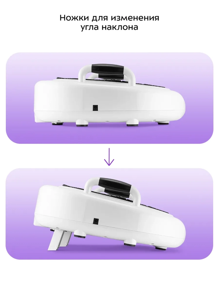 Прорезиненные ножки массажера не дают ему скользить по полу. На дне устройства также есть ножки для изменения угла наклона массажера. Прибор оснащен ручками для переноски прибора. На массажере есть место для хранения пульта ДУ.