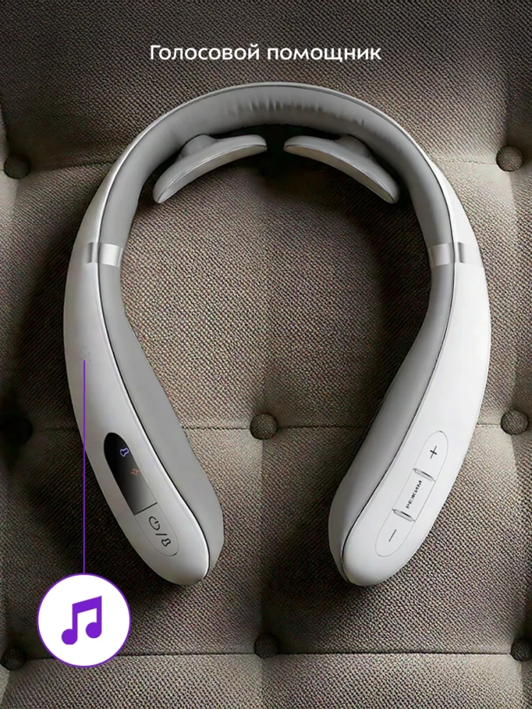 Массажер оснащен голосовым сопровождением — при нажатии на кнопку «Вкл/Выкл» и «Режим», низком уровне заряда аккумулятора и отключении массажер подает звуковые команды, сообщая о выбранном режиме, установленной интенсивности воздействия и уровне нагрева.