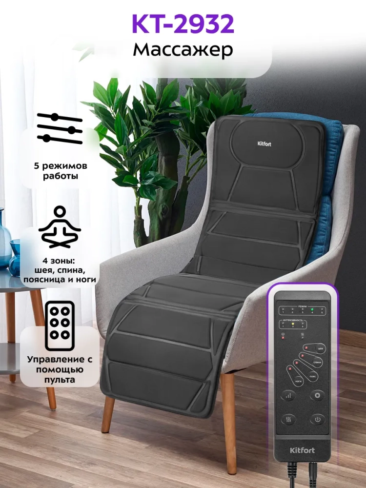 Электрическое кресло-массажер Kitfort предлагает разнообразные режимы массажа, включая импульсный и вибромассаж. Вибромассажер идеально подходит для снятия напряжения в области шеи и плеч, а также для массажа спины и поясницы. Массажное кресло обеспечивает равномерное распределение давления, что делает массаж более эффективным и приятным.