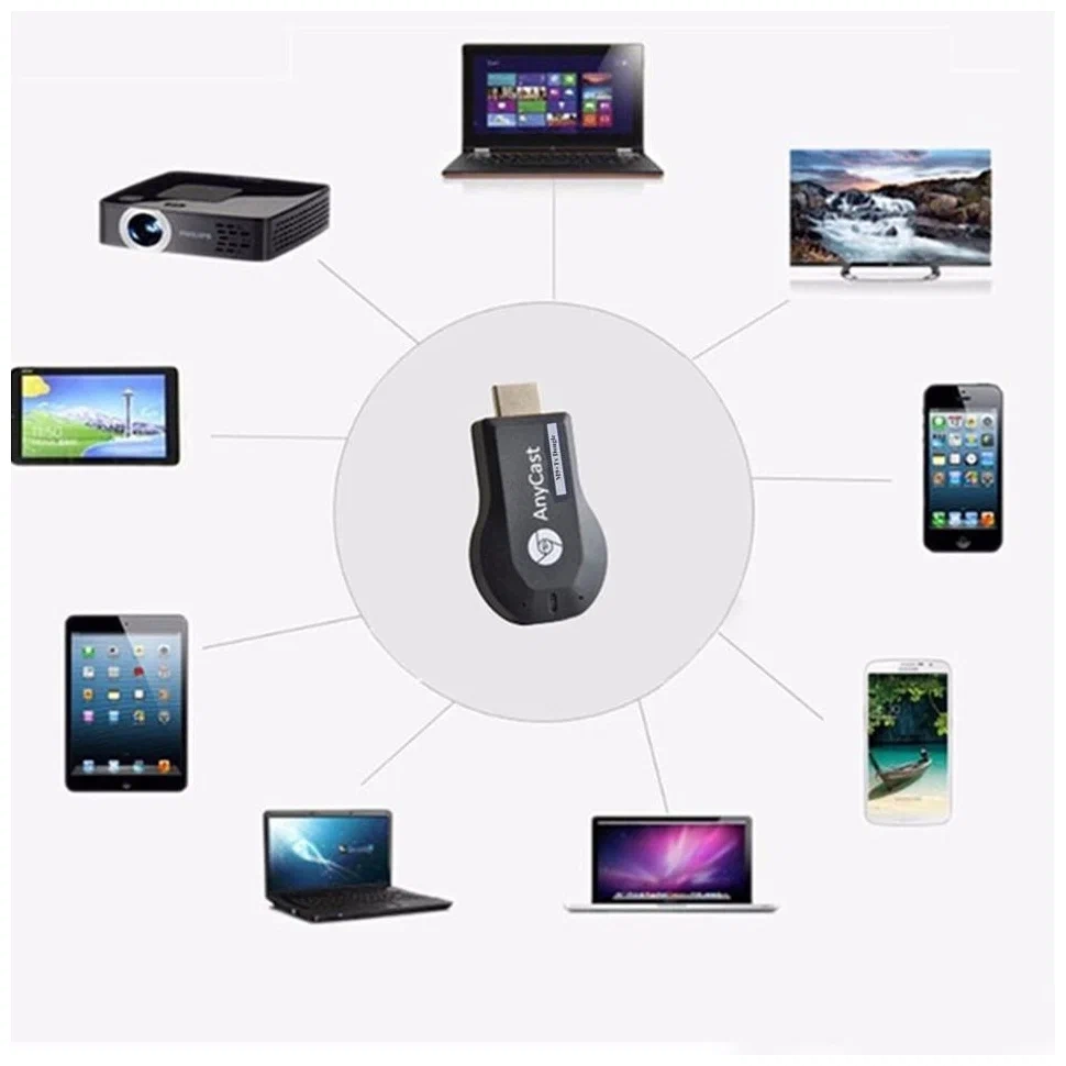 Компактный HDMI адаптер медиаплеер ресивер WiFi в HDMI AnyCAST M9 Plus - это компактный HDMI адаптер для телевизора, беспроводное WiFi устройство, которое позволит вам смотреть любое видео или фотографии со смартфона, планшета или ноутбука (iOS, Android, Windows) на телевизоре. Незаменимо при просмотре фотографий, видео, фильмов, игр в широкоформатном режиме.Помимо этого он позволяет прослушивать музыку, смотреть странички в интернет, просматривать документы. Подключается к мобильному устройству по WiFi.Особенности: Беспроводное соединение. Плеер снабжен адаптером Wi-Fi, способным охватывать большие помещения. Благодаря поддержке Miracast он может принимать высококачественное мультимедиа (например HD-видео) без каких-либо задержек и помех. Простота использования. Непосредственная связь устройств между собой без использования маршрутизатора беспроводной сети и установки дополнительного софта. Легкая установка. Простое подключение к телевизору - надо только подключить медиаплеер к разъему HDMI и к свободному порту USB в телевизоре. Устройство не нуждается в обязательном подключении к сетевому адаптеру. Характеристики: Чип: RK3036 Скорость: (МГц) 1200 мГц Оперативная память: (МБ) DDR3 128 Mb Внутренняя память: (mb) 128 Mb Максимальное разрешение: (1920 * 1080_60p) для H.265 USB USB2.0 Мощность: DC5V/1A Wifi модуль: IEEE 802.11a/g/b Wifi частота: 2.4 Гц Видео-форматы: avi,.divx,.mkv,.ts,.dat,.vob,.mpg,.mpeg,.mov,.mp4,. rm,. rmvb, Формат изображения: JPEG, BMP Аудио-форматы: mp1/MP2/MP3 DLNA Стандартный В комплекте идёт шнур, который позволяет подсоединить устройство к сети, для правильной работы. Один конец кабеля идёт с разъёмом под HDMI, а второй со специальной кнопкой, для переключения режимов.Подключение anycast к телевизору происходит так: адаптер вставляется в телевизор в разъём HDMI. Если у вас нет такого выхода, тогда потребуется переходник. При подключении приспособление должно загореться синим цветом. Это значит, что оно готово к работе. Для питания и переключения режимов в адаптер необходимо вставить специальный шнур, который идёт в комплекте.После подключения anycast к ТВ. Нажимаем на пульте кнопку input. На экране телевизора должно появиться меню с несколькими вариантами. Находим в списке HDMI и нажимаем на него. После этого на экране должна появиться картинка с инструкцией, что необходимо сделать.После чего делаем настройку устройства:Первый способ (простой):1. Скачиваем приложение EZMira на телефон.2. Следуем инструкции на экране, считываем QR код и подключаемся к устройству.3. После подключения на открывшемся окне в приложении выбираем вашу домашнюю сеть и вводим пароль от нее.Второй способ:1. Подключаем адаптер к домашней сети wi-fi. Чтобы это сделать, необходимо на смартфоне включить вай-фай и найти доступную сеть с названием Anycast. Чтобы к ней подключить введите пароль от 1 до 8.2. После подключения к сети заходим в мобильный браузер и вводим в поисковую строку: 192.168.49.1 b. На экране должна появиться настройка приспособления.3. Нажимаем на первый значок, выбираем домашнюю сеть.4. Подключаемся к выбранной сети.Всё готово! Вы подключились к своему телевизору и можете выводить любое видео, фото или аудио на большой экран. Чтобы отключиться от адаптера необходимо будет просто отключиться от беспроводной сети.внимание! Не забывайте подключать адаптер к питанию через USB.