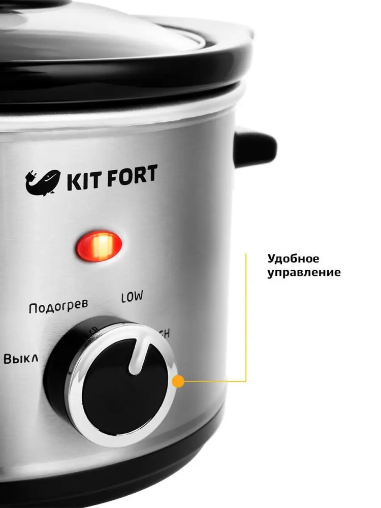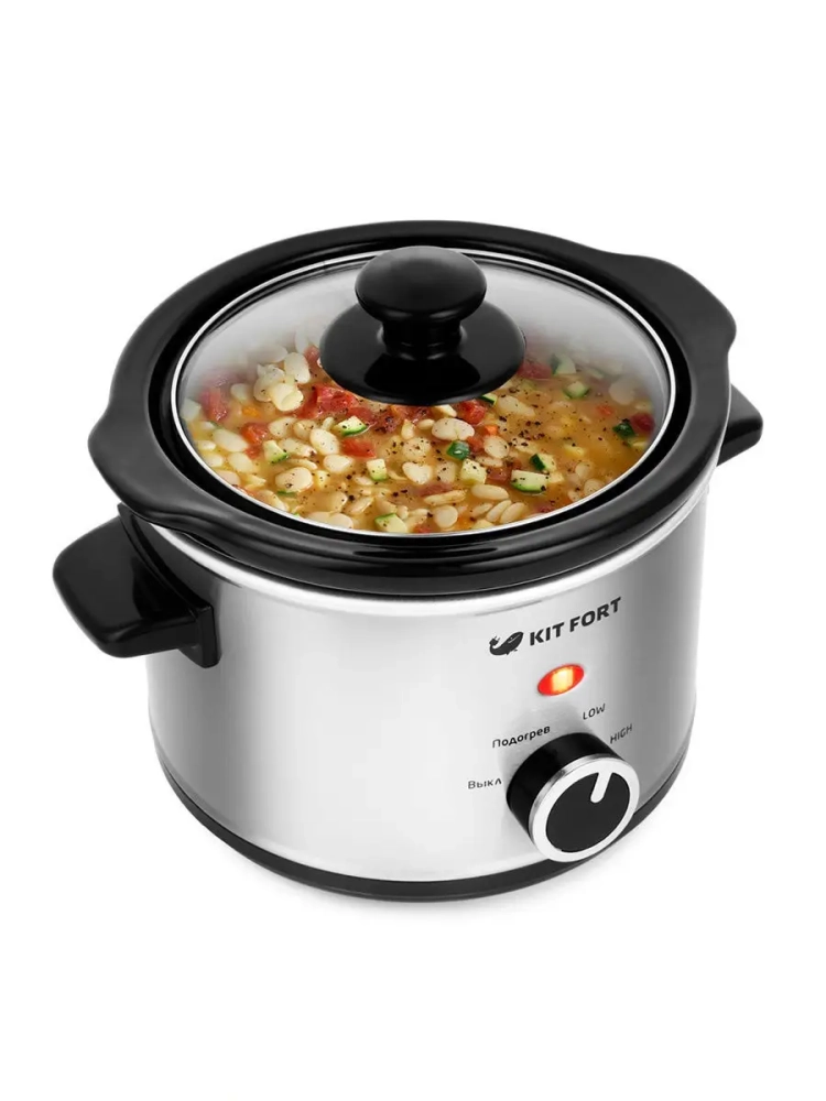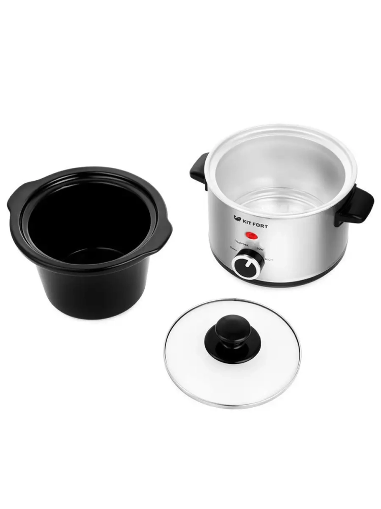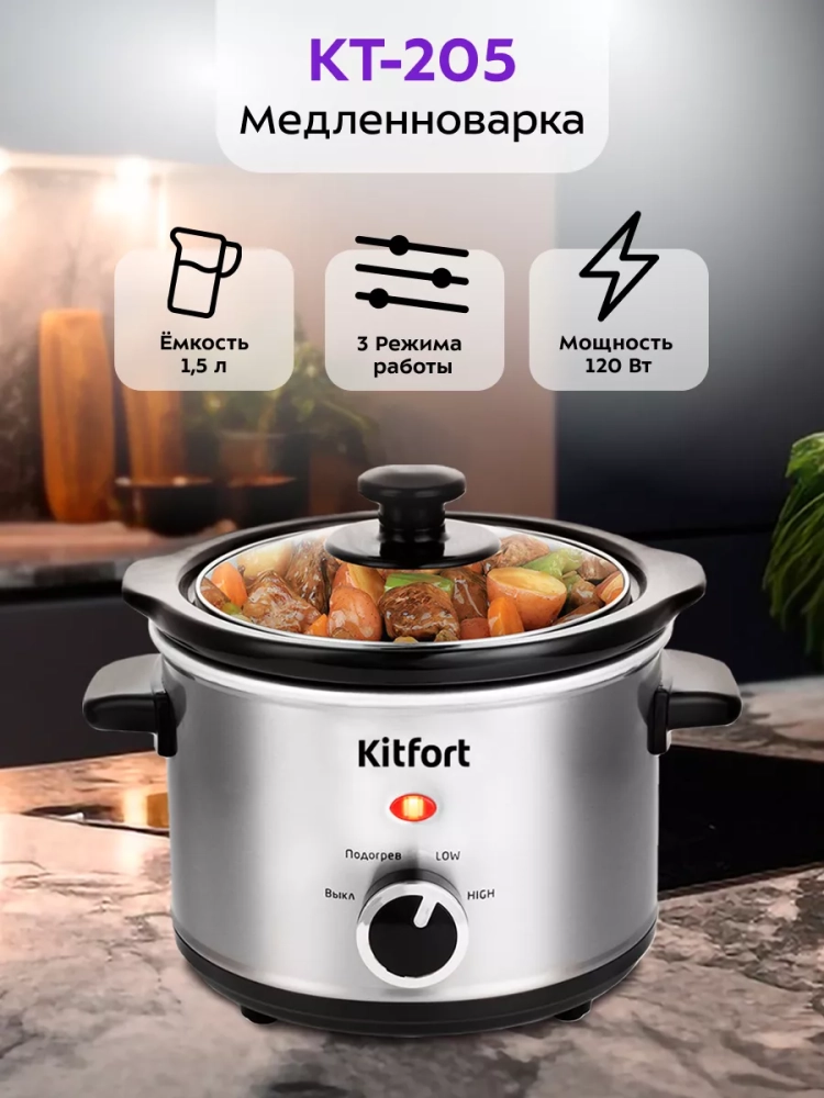 Медленноварка Kitfort КТ-205 — это простой в пользовании кухонный прибор с большим диапазоном применения. Она состоит из двойного корпуса, внутри которого по периметру расположены нагреватели, и керамической кастрюли с крышкой.