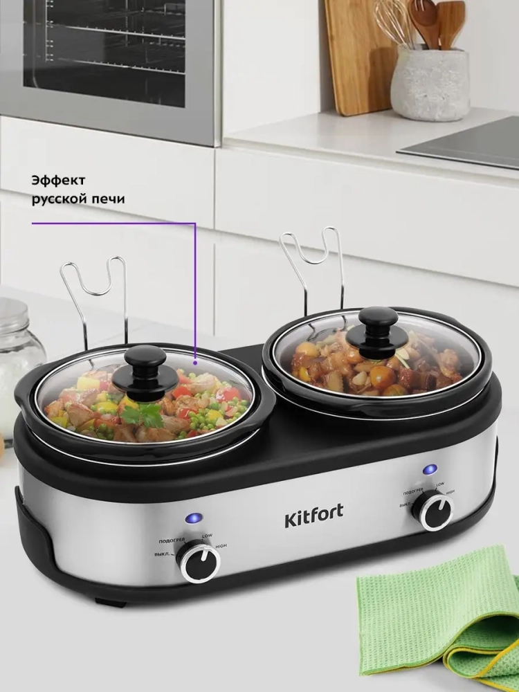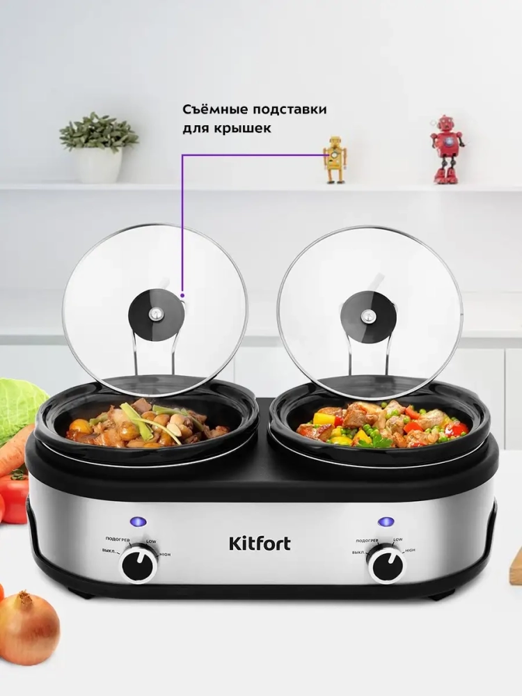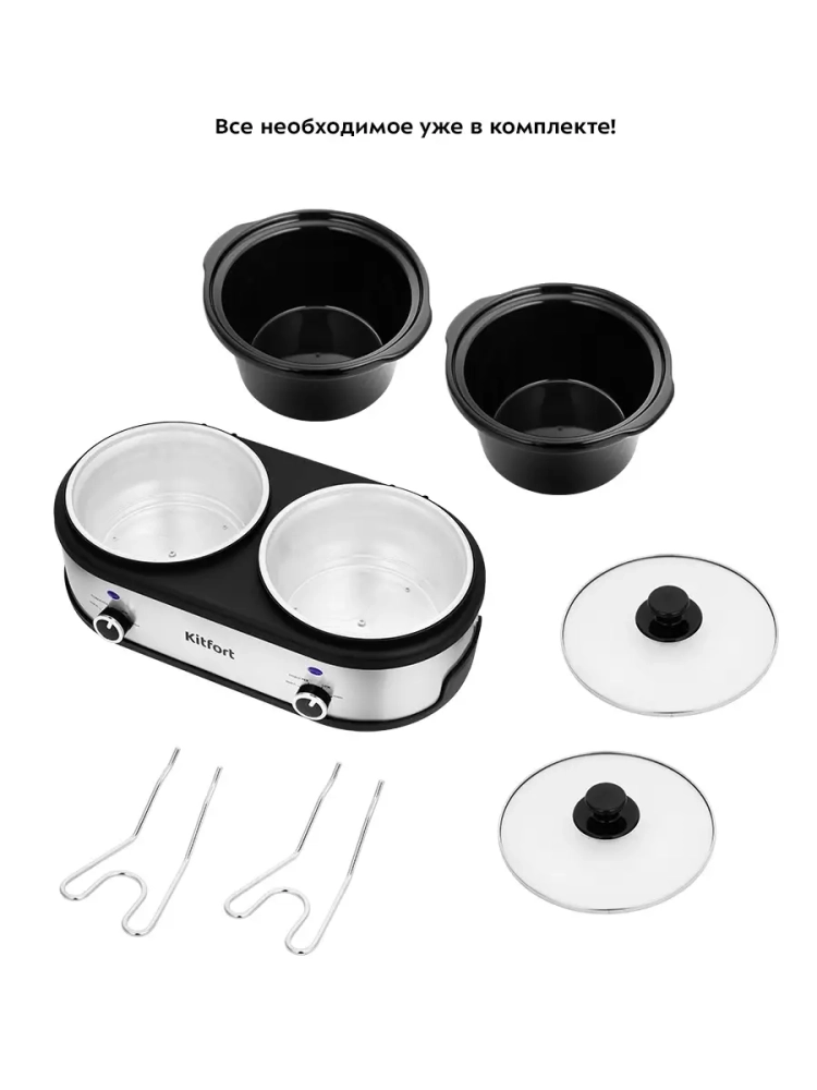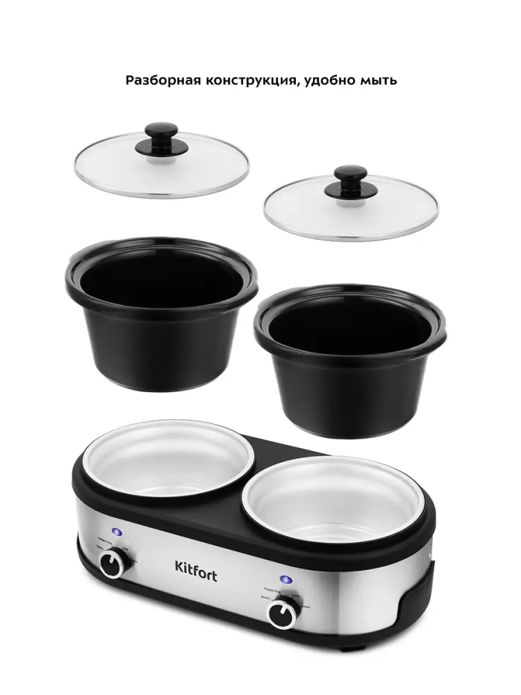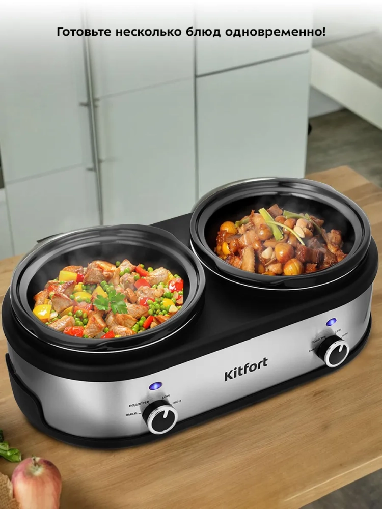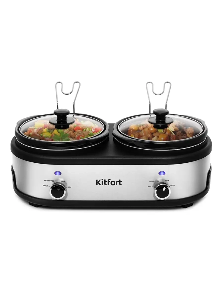 В медленноварке Kitfort KT-219 предусмотрено 2 кастрюли для приготовления, поэтому вы можете одновременно готовить разные блюда.