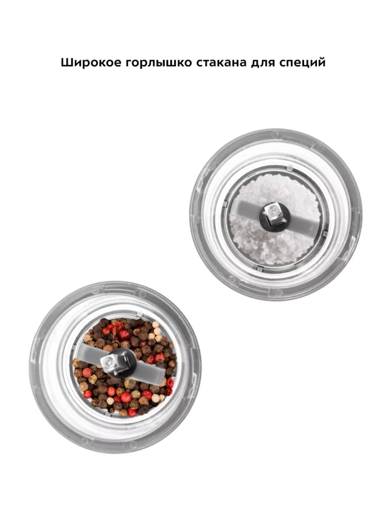 Широкое горлышко стакана для специй обеспечивает легкое и удобное заполнение мельницы перцем, солью или другими специями.