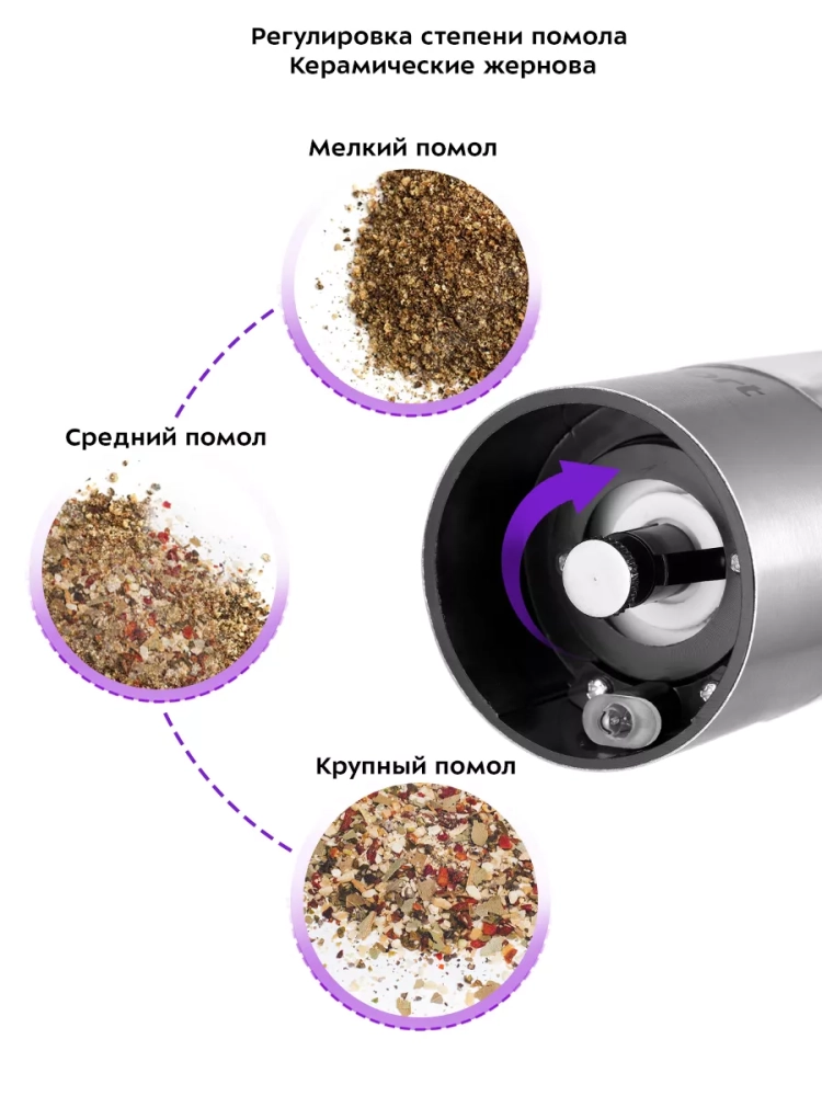 Автоматическая мельница имеет простое управление всего одной кнопкой. Поместите устройство над блюдом и нажмите на кнопку, чтобы получить быстрый помол, не прикладывая никаких усилий.