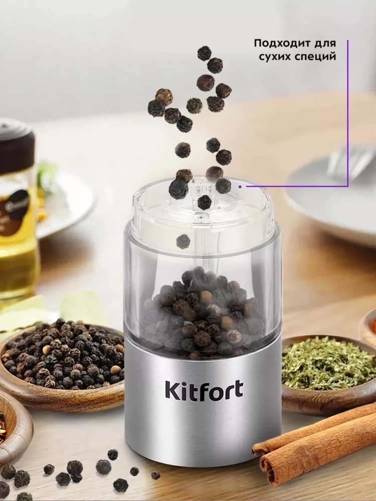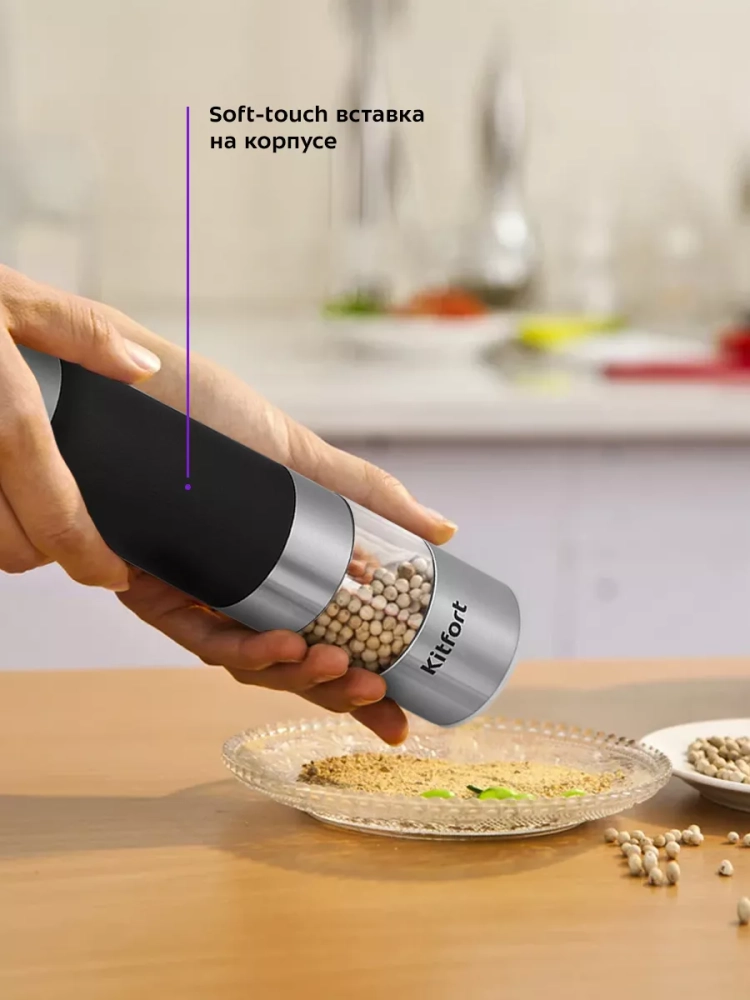 Электрическая мельница Kitfort КТ-6007 измельчает перец-горошек, соль и другие специи. Степень помола регулируется винтом. Устройство имеет конические жернова из керамики, они долговечные, не стираются и не ржавеют. Мельница удобно лежит в руке, включается одной кнопкой и работает от батареек типа АА, которых хватает на долгое время. Батарейки в комплект не входят.