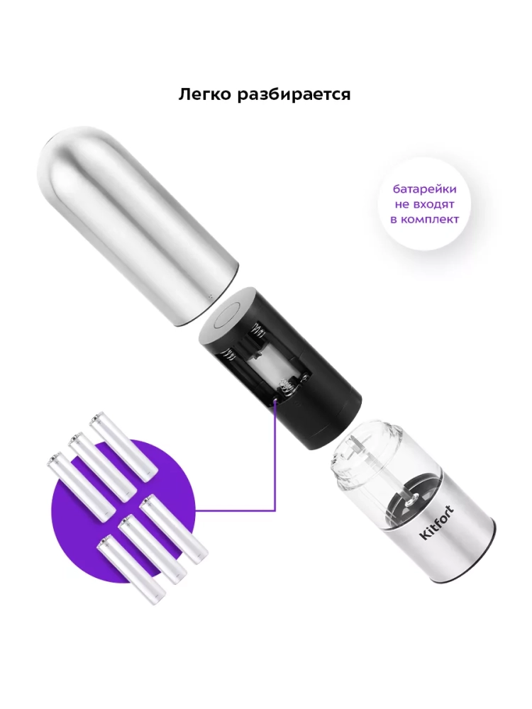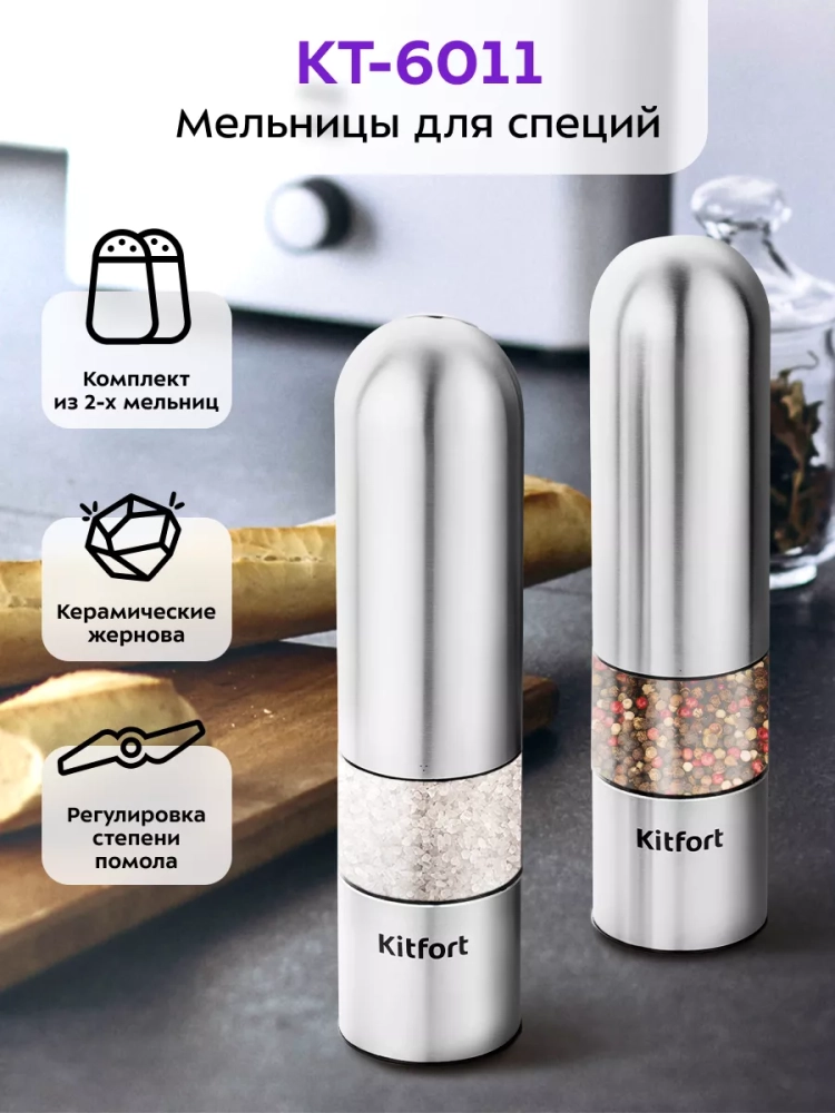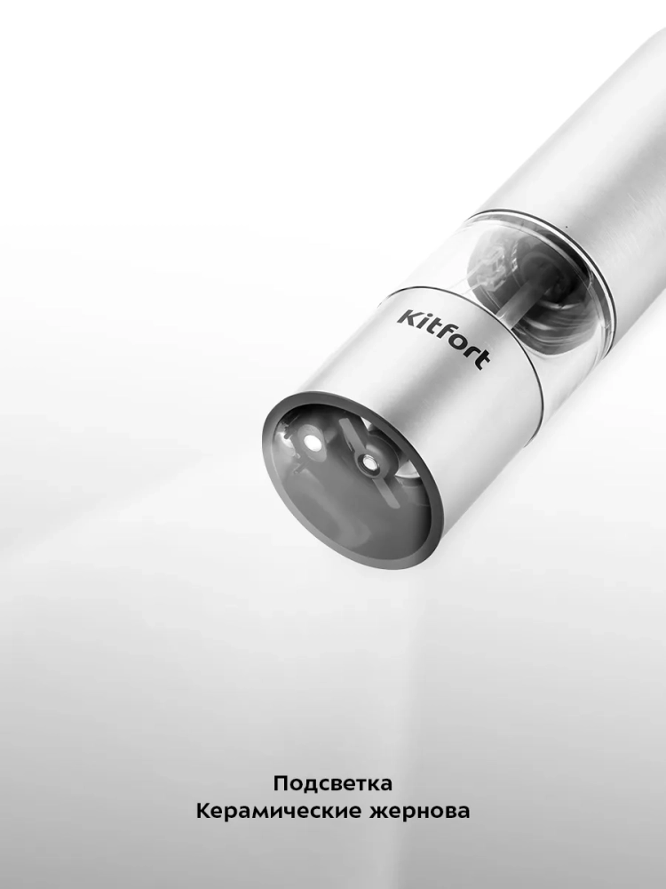 Электрическая мельница Kitfort КТ-6011 измельчает перец-горошек, соль и другие специи. Степень помола регулируется винтом. Устройство имеет конические жернова из керамики, они долговечные, не стираются и не ржавеют. Мельница удобно лежит в руке, включается одной кнопкой и работает от 6 батареек типа ААА, которых хватает на долгое время. Батарейки в комплект не входят.