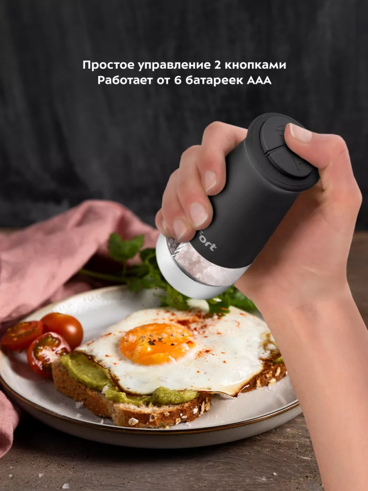 Степень помола для каждого вида специй регулируется винтом. Устройство имеет конические жернова из керамики, они долговечные, не стираются и не ржавеют. Мельница удобно лежит в руке, имеет простое управление двумя кнопками и работает от 6 батареек типа ААА, которых хватает на долгое время. Батарейки в комплект не входят.