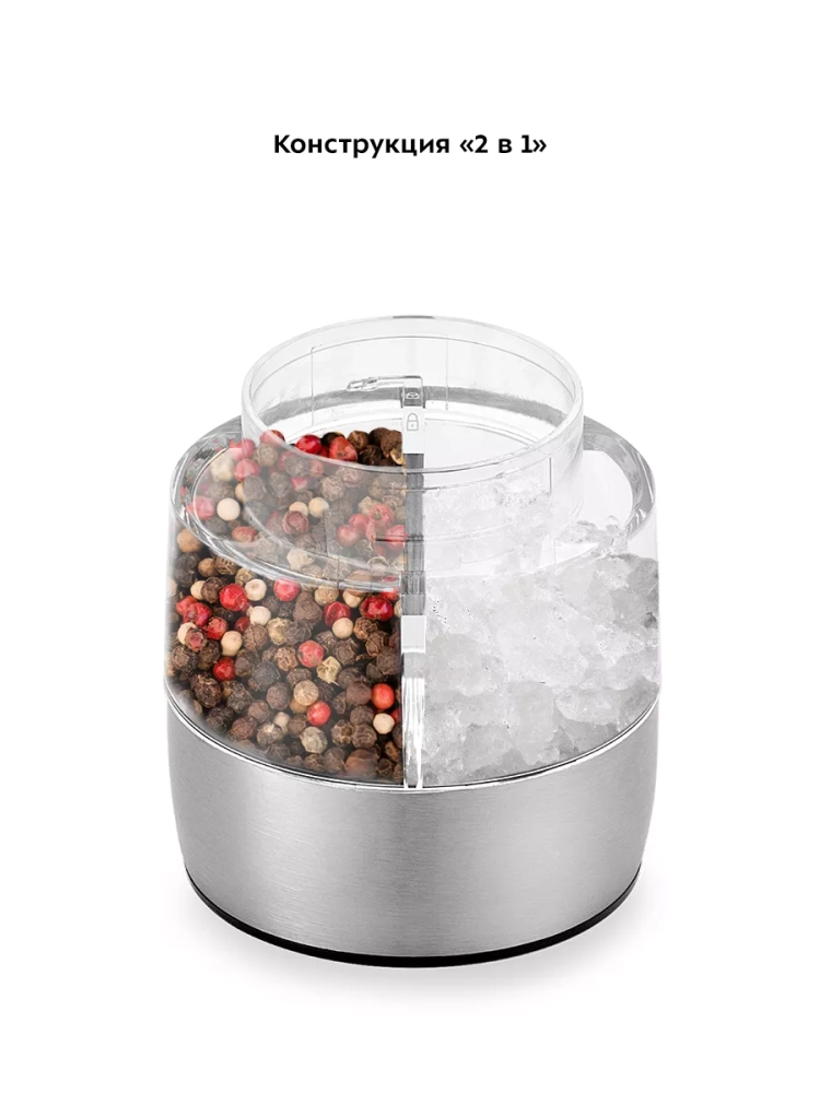 Устройство имеет конструкцию «2 в 1»: емкость для специй разделена на две части для измельчения двух видов специй. Мельница выполнена из сочетания пластика и нержавеющей стали с прозрачной емкостью для специй, что позволит следить за количеством содержимого в ней.