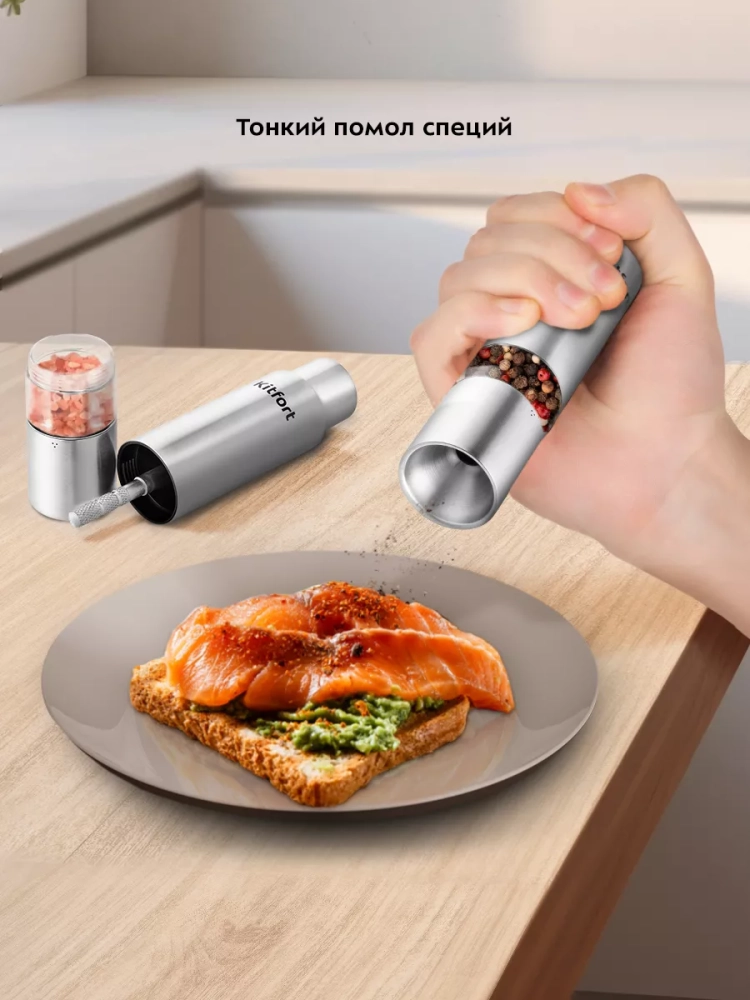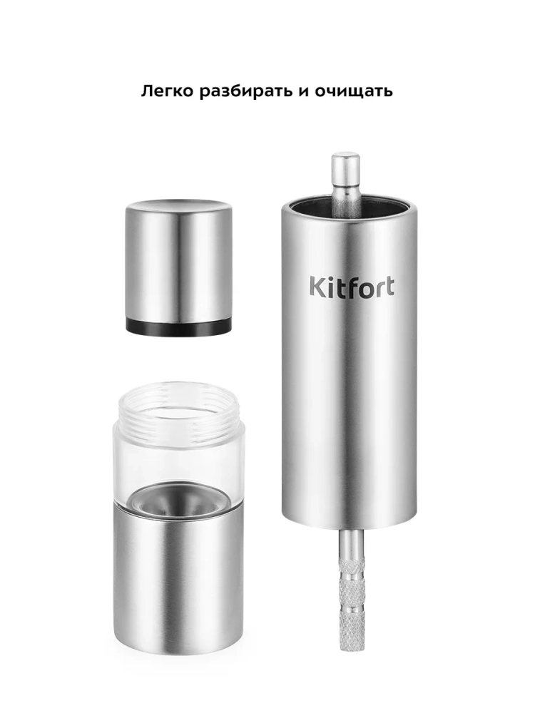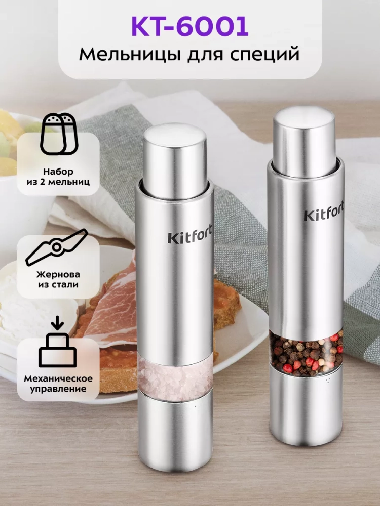 Механическая мельница Kitfort КТ-6001 измельчает перец-горошек, соль и другие специи. Устройство имеет жернова из нержавеющей стали, они надежны и долговечны. Измельчение происходит за счет движения толкателя. Степень помола не регулируется. Мельница производить только тонкий помол.