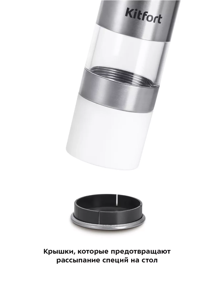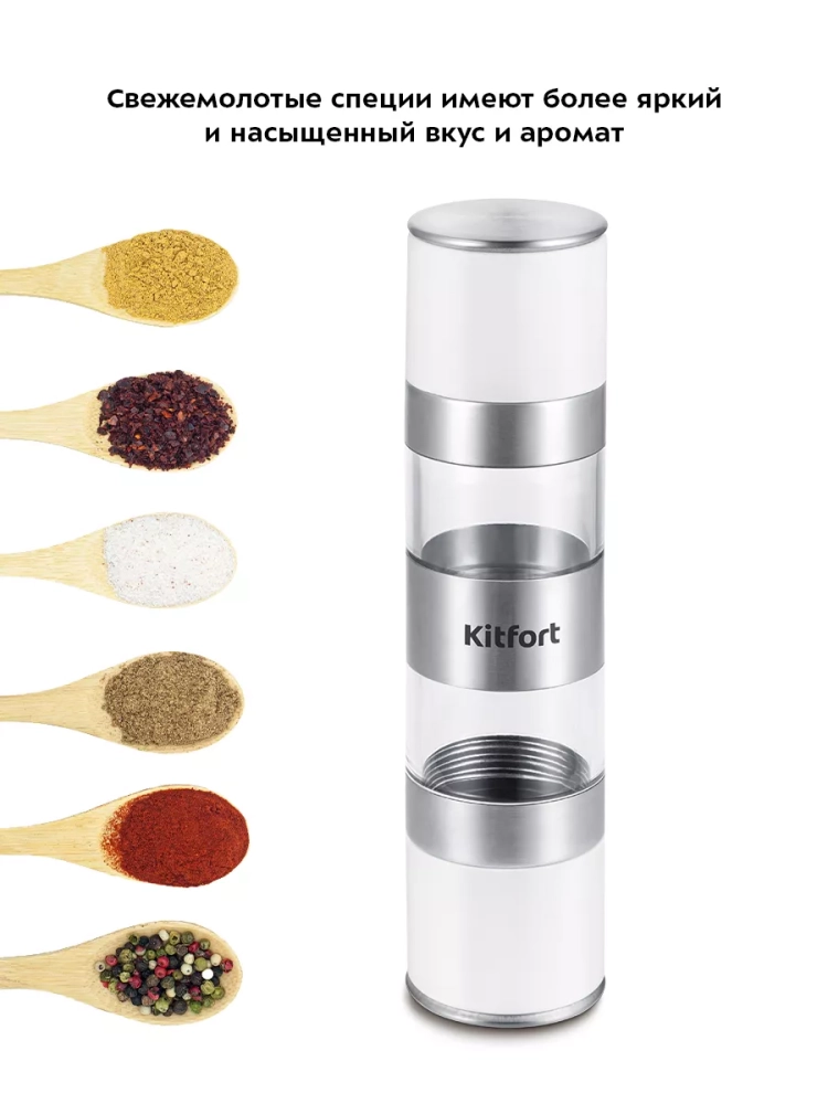 Мельница для соли и перца Kitfort КТ-6008 является двухсторонней механической мельницей, которая измельчает перец-горошек, соль и другие специи. Степень помола регулируется винтом. Устройство имеет конические жернова из керамики, они долговечные, обеспечивают однородный помол, не подвержены коррозии и не ржавеют.