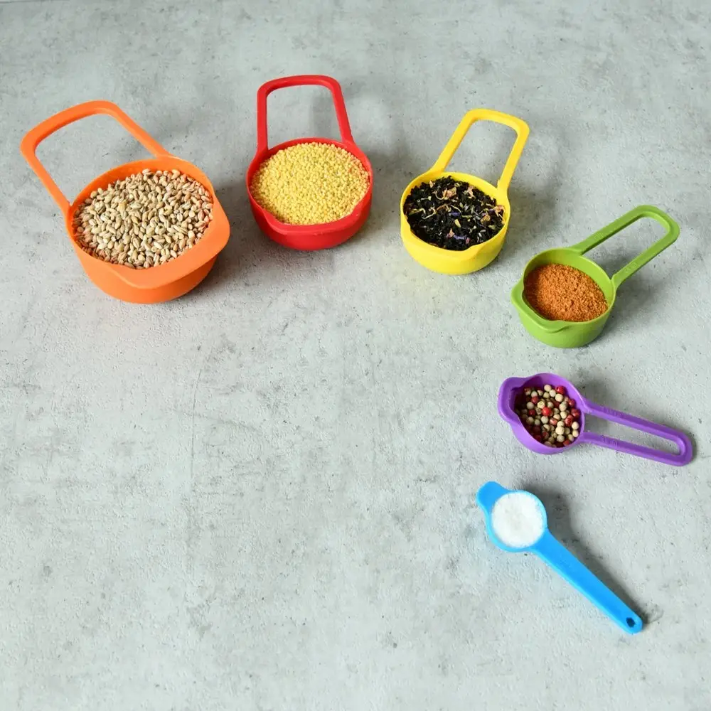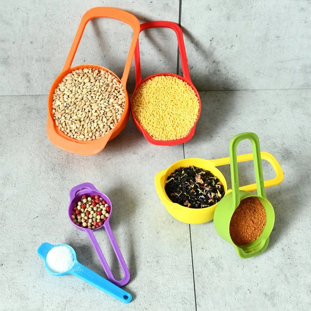 Мерные ложки – яркий и удобный аксессуар для современной хозяйки. Это, своего рода, точный измерительный прибор для определения массы сыпучих, либо жидких продуктов: муки, соли, сахара, соды, молока, воды, меда, растительного масла, специй и прочих ингредиентов. Удобны в хранении, так как укладываются друг в друга и не занимают много места. Изготовлено: пластмасса (полипропилен). В комплекте шесть разных ложек, которые соответствуют следующим объемам: 7,5мл; 15мл, 60мл; 85мл; 125мл, 250мл.