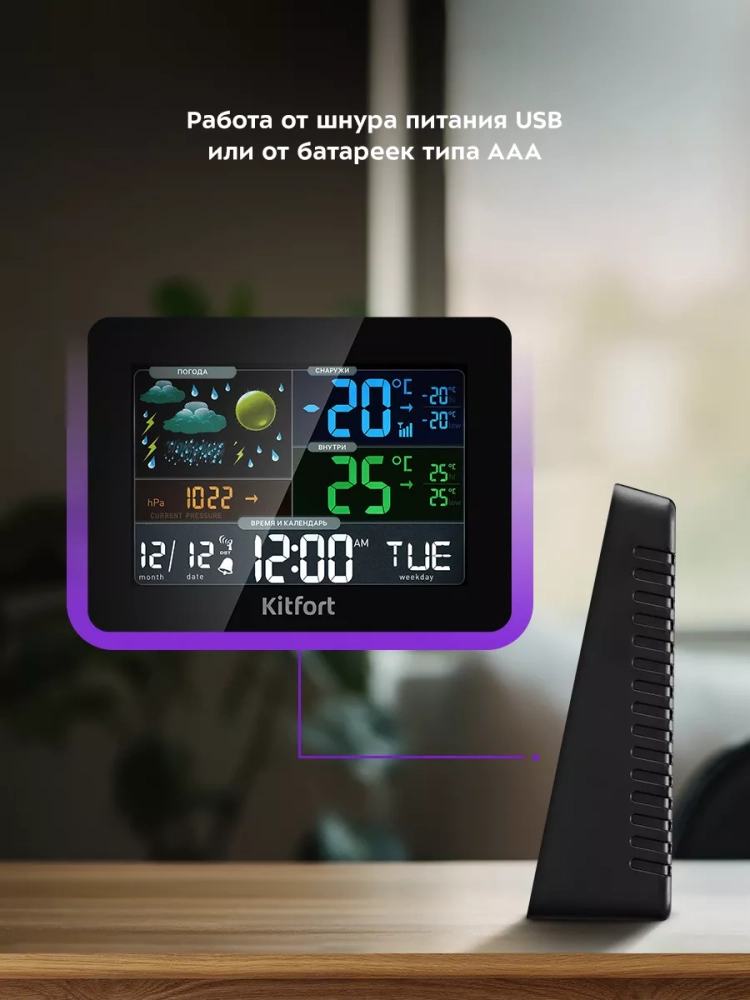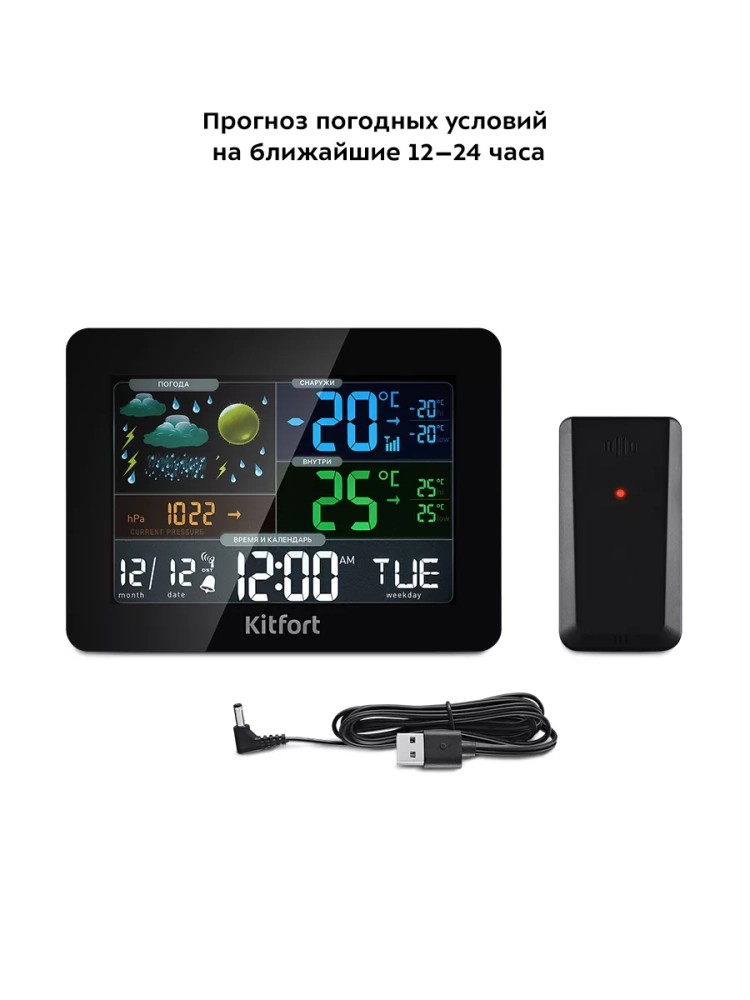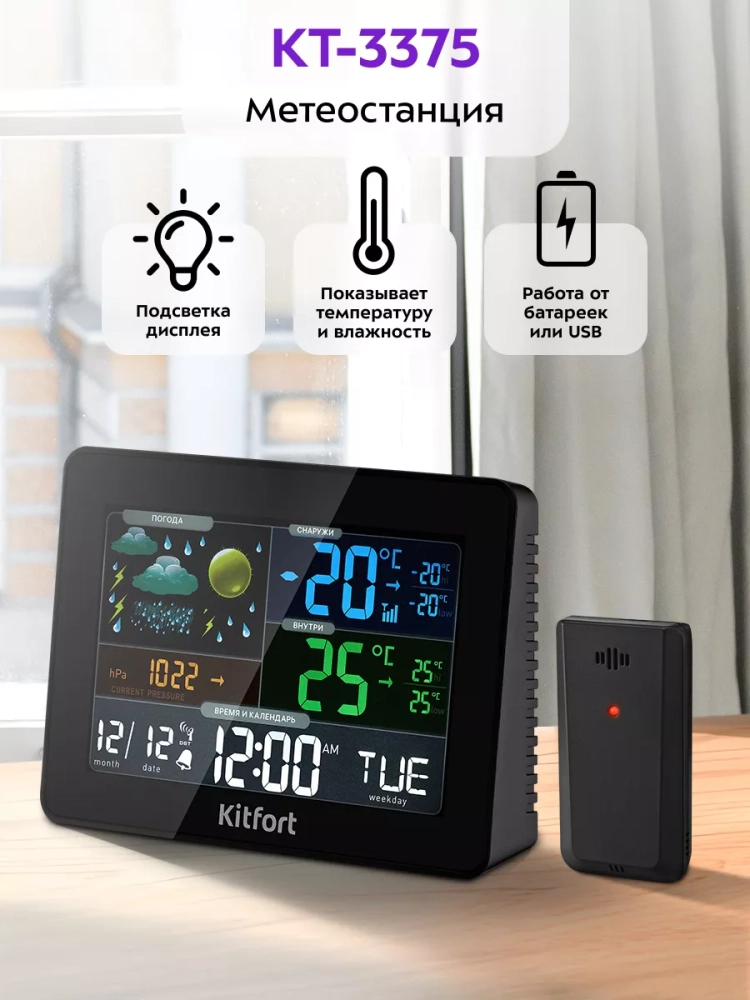 Метеостанция Kitfort KT-3375 — это прибор, который позволит следить за показаниями температуры в помещении и на улице, погодой, атмосферным давлением. Устройство прогнозирует погодные условия на ближайшие 12–24 часа на основе изменения атмосферного давления. Температура может отображаться в градусах Цельсия (°С) или Фаренгейта (°F), а атмосферное давление — гектопаскалях или дюймах ртутного столба.