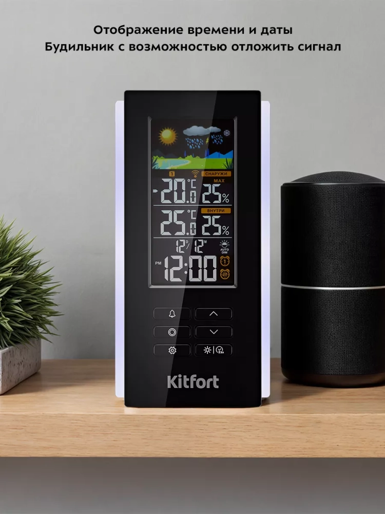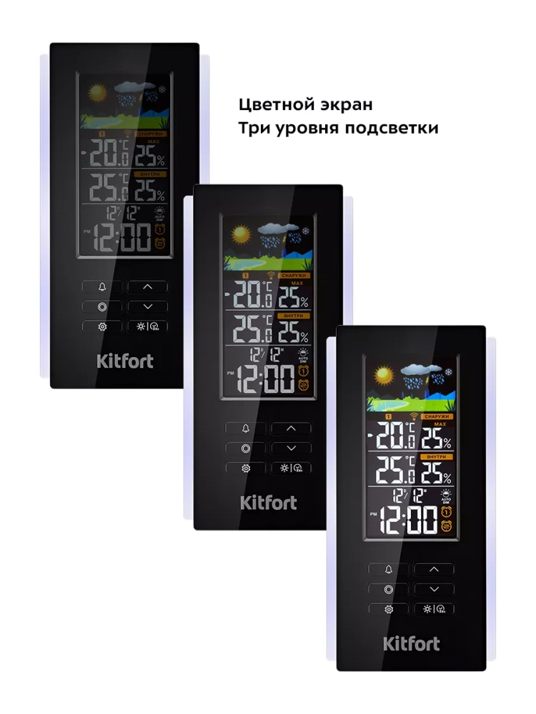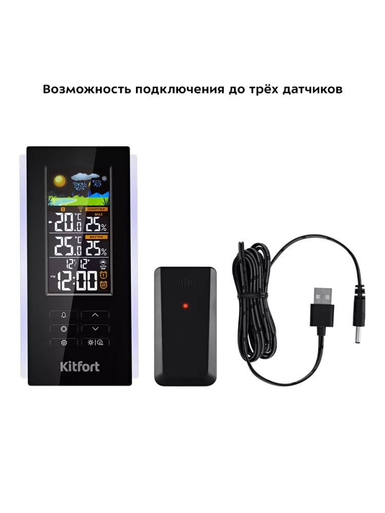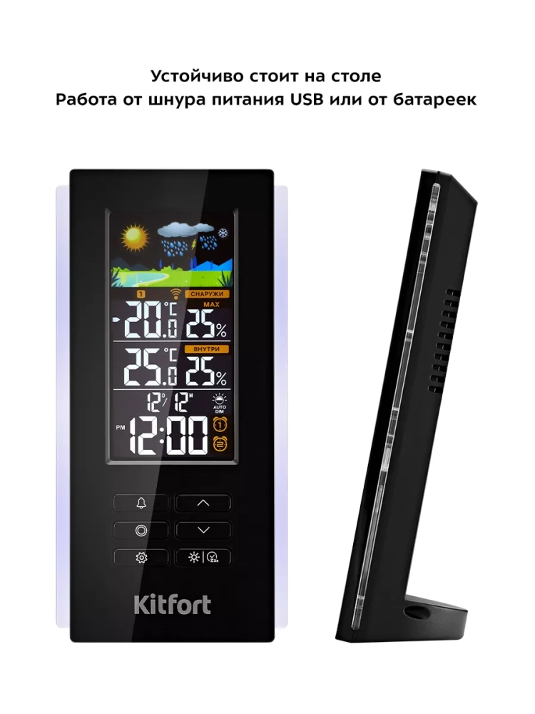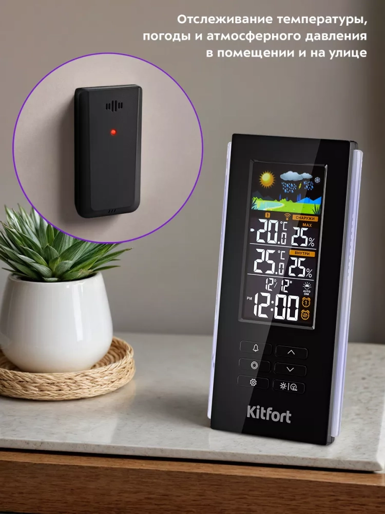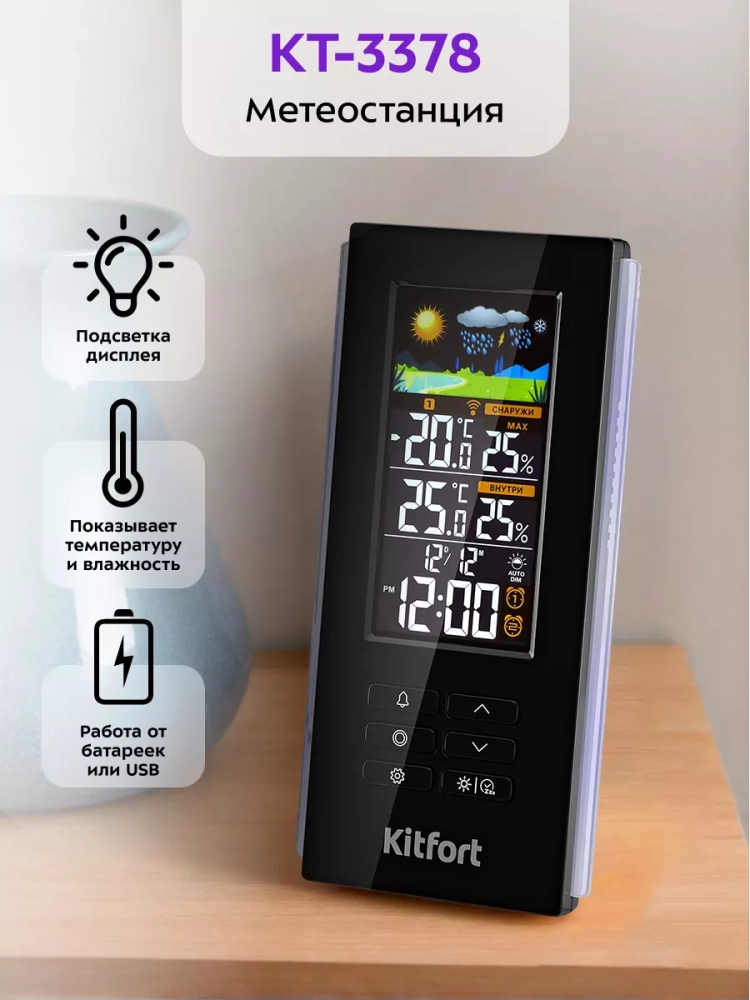 Метеостанция Kitfort KT-3378 — это прибор, который позволит следить за показаниями температуры и влажности в помещении и на улице, а также погодой. Есть возможность выбрать единицы измерения температуры: градусы Цельсия (°С) или Фаренгейта (°F). Устройство прогнозирует погодные условия на основе изменения атмосферного давления.