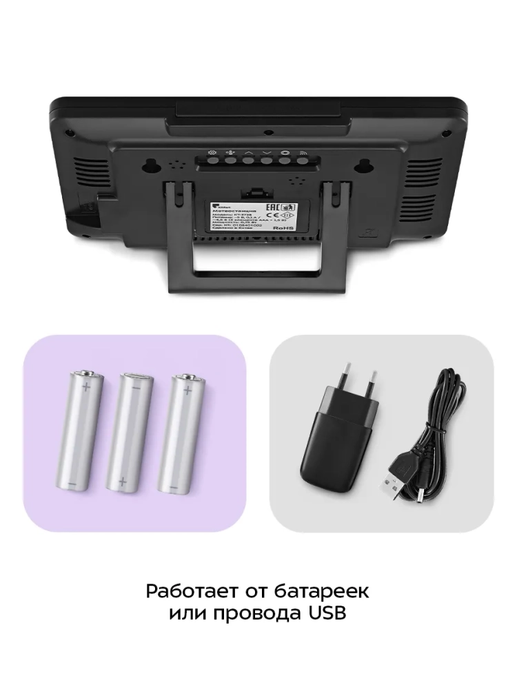 Метеостанция может работать как через USB-шнур (входит в комплект), подключенный к блоку питания, компьютеру или пауэрбанку, так и от 3 батареек типа AАA (не входят в комплект), благодаря чему ее можно расположить в любом удобном для вас месте. Прибор можно повесить на стену или поставить на стол. На задней части устройства расположены два отверстия для настенного крепления и складная ножка.
