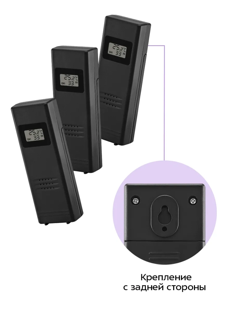 Данная модель оснащена тремя датчиками для получения показаний температуры на улице. Показания со всех датчиков отображаются на дисплее метеостанции одновременно. У датчиков есть дисплей, на котором также отображаются значения температуры и влажности. Датчик можно повесить на стену, для этого предусмотрено отверстие для настенного крепления. Вы можете поместить датчик не на улице, а в другом помещении, например, погребе. Датчик работает от 2 батареек типа AA (не входят в комплект).