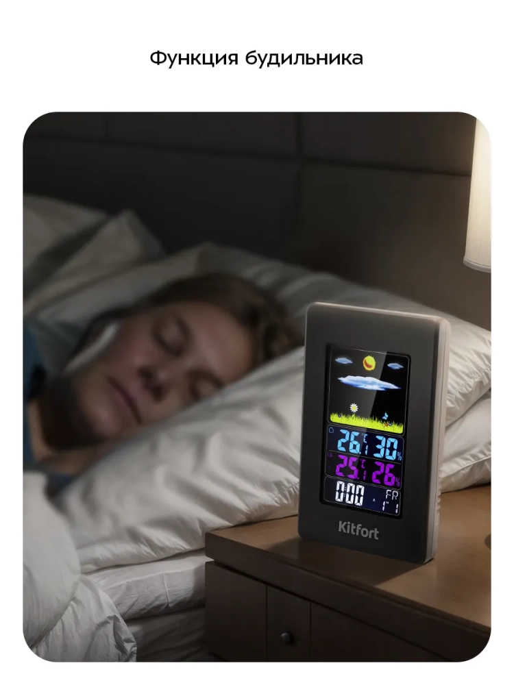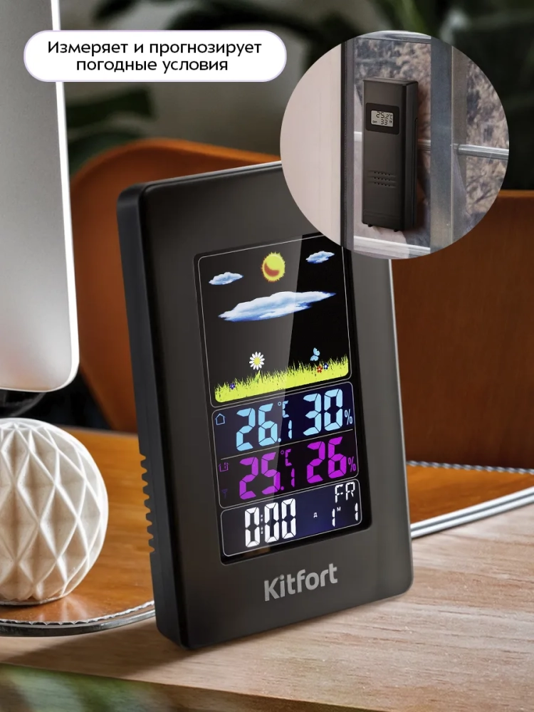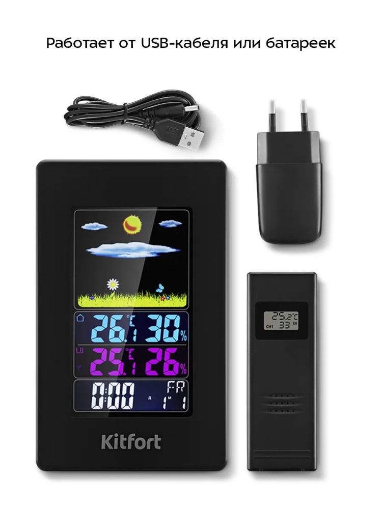 Метеостанция Kitfort KT-3730 — это прибор, который позволит следить за показаниями температуры и влажности как в помещении, так и на улице. Есть возможность выбрать единицы измерения температуры: градусы Цельсия (°С) или Фаренгейта (°F). Устройство прогнозирует погодные условия на основе изменения температуры и влажности.