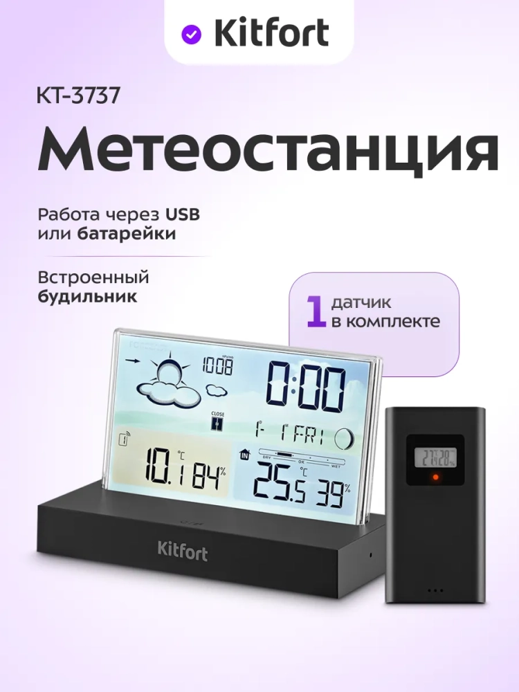 Метеостанция Kitfort KT-3737 — это прибор, который позволяет регулярно отслеживать температуру и влажность воздуха в помещении и на улице, а также контролировать атмосферное давление и его динамику. Температура может отображаться в градусах Цельсия (°С) или Фаренгейта (°F). В качестве единицы измерения атмосферного давления можно выбрать гектопаскаль (hPa)/миллибар (mb) или дюйм ртутного столба (inHg). Устройство прогнозирует погодные условия на ближайшие 12 часов на основе изменения атмосферного давления.