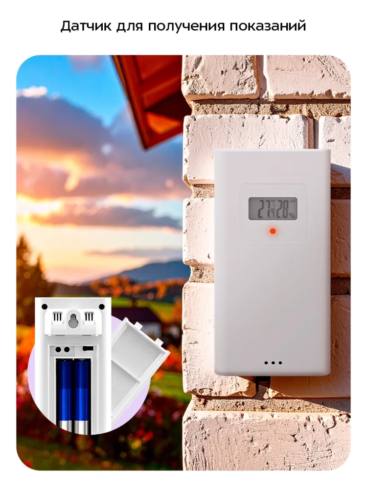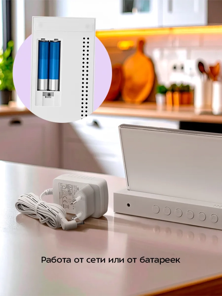 Устройство подключается к источнику питания с помощью блока питания из комплекта. Метеостанция может работать также от 2 батареек типа AАА (в комплект не входят), благодаря чему ее можно расположить в любом удобном для вас месте.