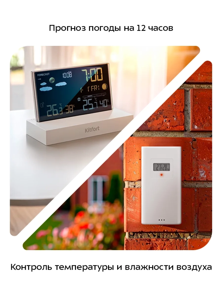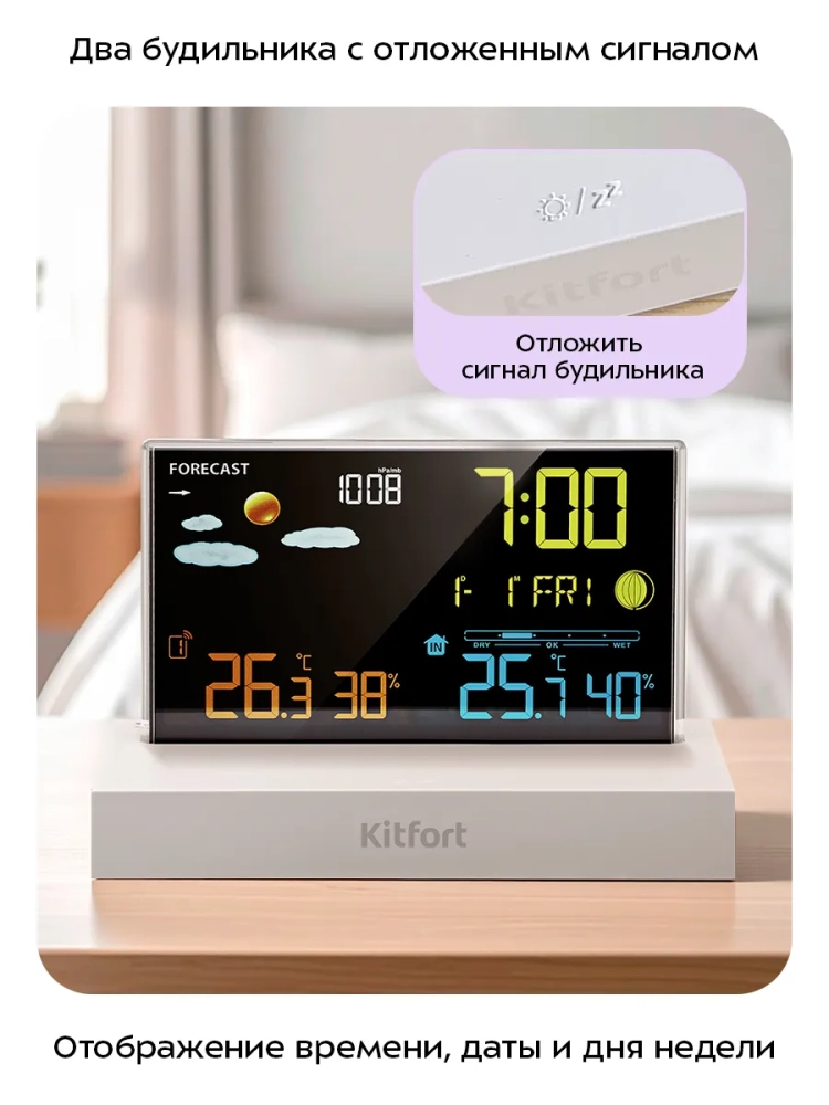 Метеостанция Kitfort KT-3738 — это прибор, который позволяет регулярно отслеживать температуру и влажность воздуха в помещении и на улице, а также контролировать атмосферное давление и его динамику. Температура может отображаться в градусах Цельсия (°С) или Фаренгейта (°F). В качестве единицы измерения атмосферного давления можно выбрать гектопаскаль (hPa)/миллибар (mb) или дюйм ртутного столба (inHg). Устройство прогнозирует погодные условия на ближайшие 12 часов на основе изменения атмосферного давления.