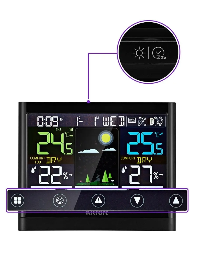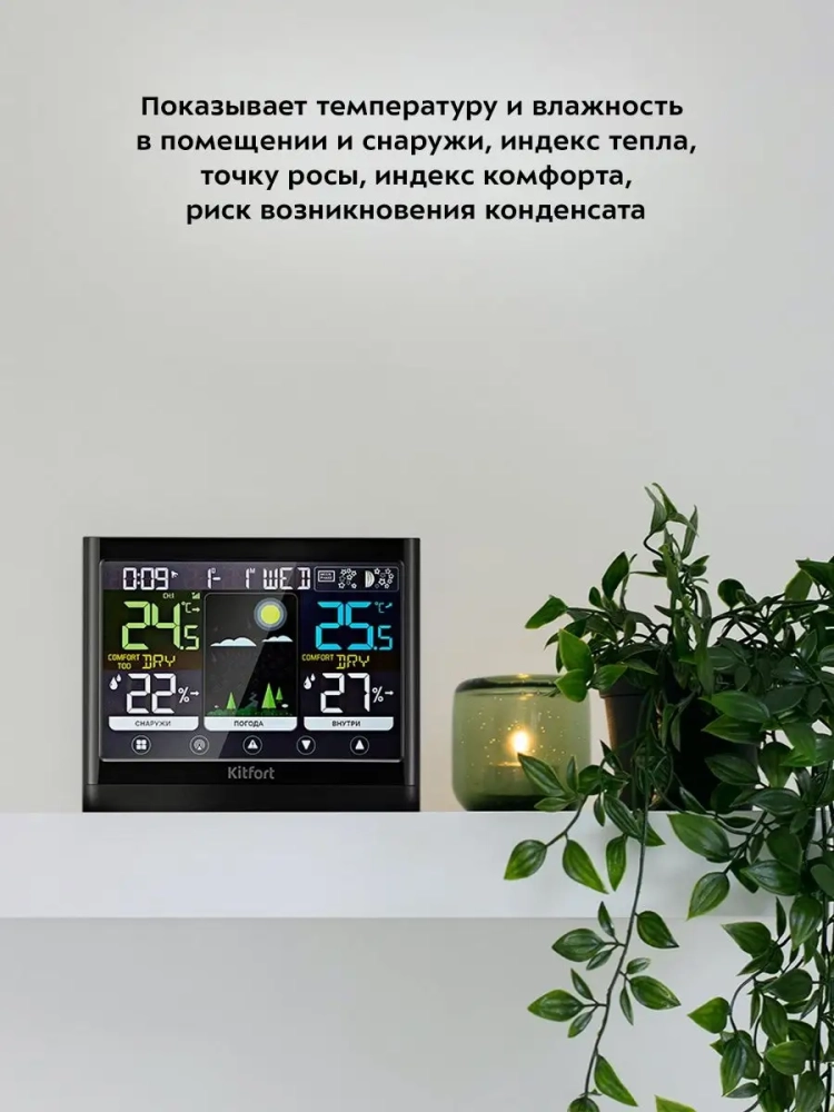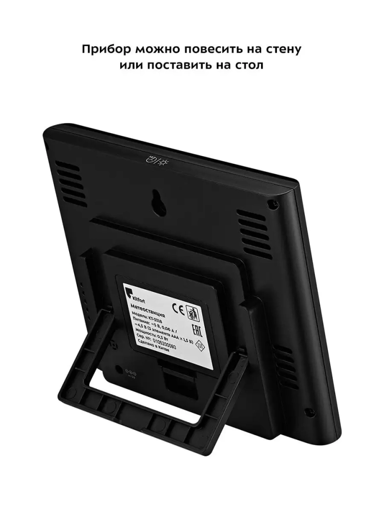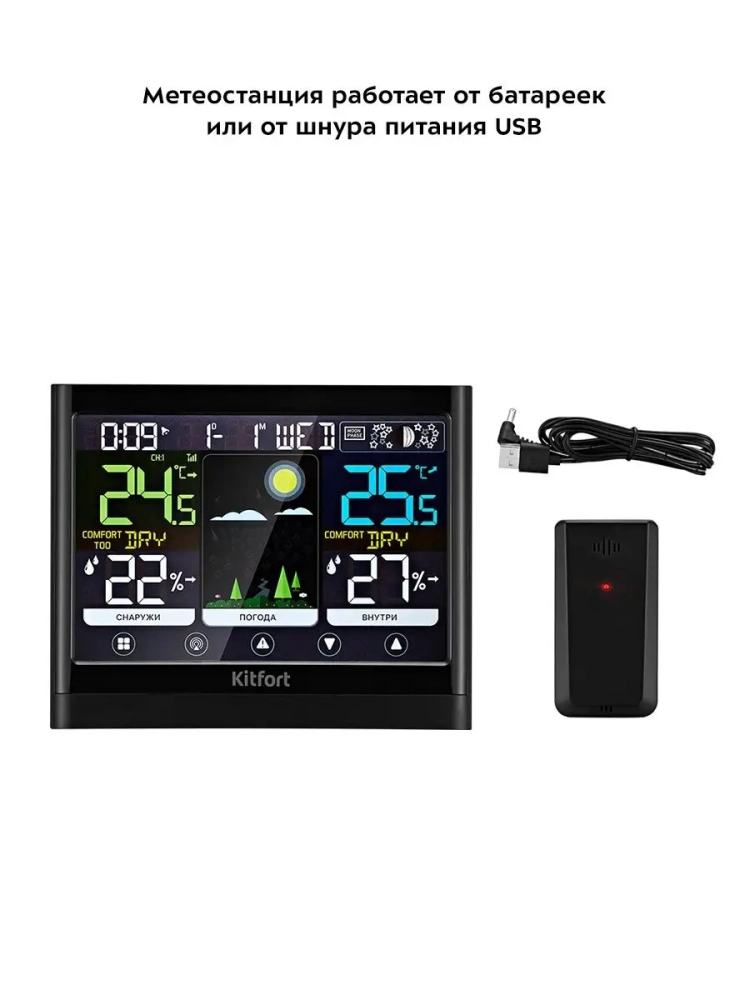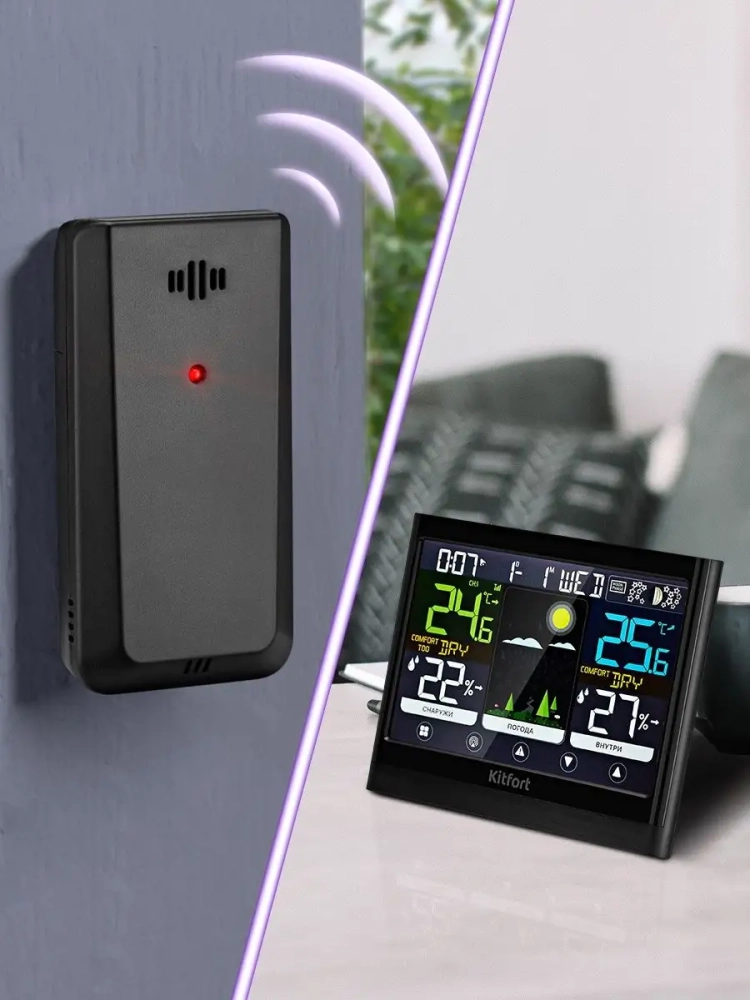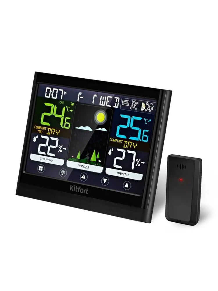 Метеостанция Kitfort KT-3318 — это прибор, который позволит следить за показаниями температуры и влажности в помещении и на улице, фазой луны, погодой. Устройство прогнозирует погодные условия на ближайшие 12–24 часа на основе изменения температуры и влажности. Также KT-3318 показывает время, дату, день недели, может служить будильником. Сигнал будильника можно отложить на 5 минут. Вы поймете, если воздух станет слишком сухим или наоборот влажным в помещении и за его пределами, благодаря значкам индикатора комфорта. Метеостанция оповестит вас о риске возникновения конденсата, который может негативно сказываться на вашем здоровье, мебели и предметах интерьера, технике. На экране метеостанции вы можете узнать значения индексом тепла и точкой росы. Индекс тепла определяет субъективную температуру, которую ощущает человек в зависимости от измеренной температуры и относительной влажности. Значение точки россы определяет температуру, которая необходима, чтобы выпала роса (конденсат). Метеостанция показывает максимальные и минимальные значения температур и влажности в помещении и на улице за сутки, тенденцию изменения температуры и влажности: повышение, понижение, без изменений. Метеостанция может работать как через USB-шнур (входит в комплект), подключенный к компьютеру или пауэрбанку, так и от 3 щелочных батареек типа AAA (не входят в комплект), благодаря чему ее можно расположить в любом удобном для вас месте. Прибор можно подвесить на стену или поставить на стол. На задней части устройства расположено отверстие для настенного крепления и складная ножка. Данная модель оснащена одним датчиком, у которого есть отверстие для настенного крепления, для получения показаний температуры и влажности снаружи помещения. Питание датчика происходит от 2 щелочных батареек типа AAA (не входят в комплект).