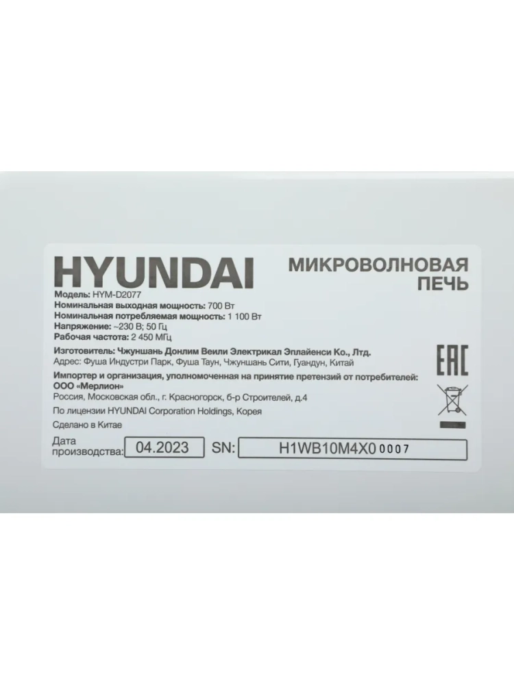 Микроволновая печь (СВЧ) Hyundai HYM-D2077 белый, мощность 700Вт, объем 20л, покрытие камеры эмаль, электронное управление.