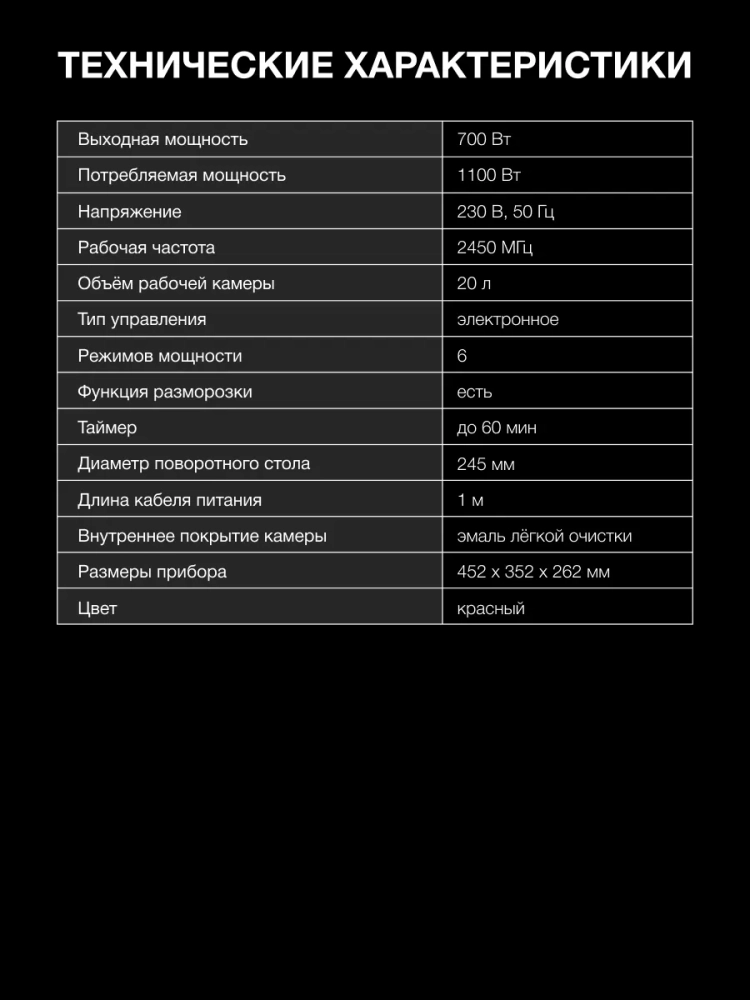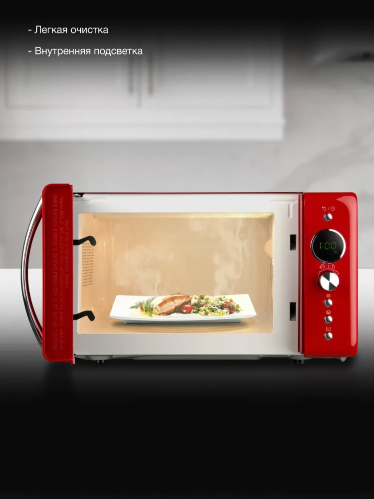 Объем рабочей камеры составляет 20 литров, диаметр поворотного стола — 245 мм, что позволяет разместить как стандартные тарелки, так и посуду большего диаметра. Внутри камера покрыта эмалью легкой очистки, а внутреннее освещение помогает следить за процессом, не открывая дверцу.