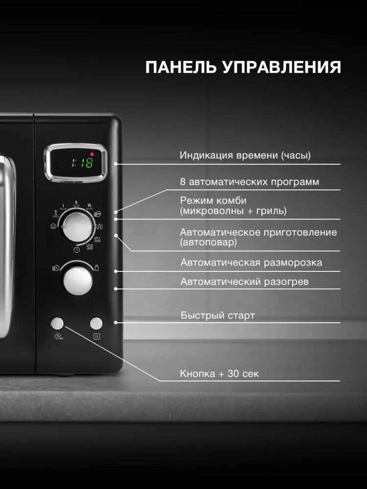 Элегантный черный корпус придаст вашей кухне современный и стильный вид. Микроволновая печь легко впишется в любой интерьер и займет достойное место на столешнице.
