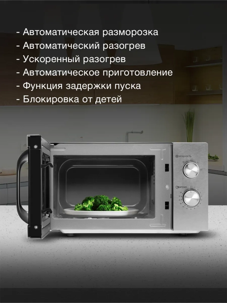Максимальная мощность составляет 700 Вт, а таймер можно установить на время до 35 минут. Минимальный уровень мощности идеально подходит для бережной и быстрой разморозки продуктов. Для разморозки предусмотрен автоматический режим, который делает этот процесс еще проще.