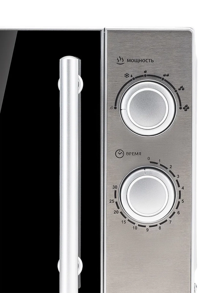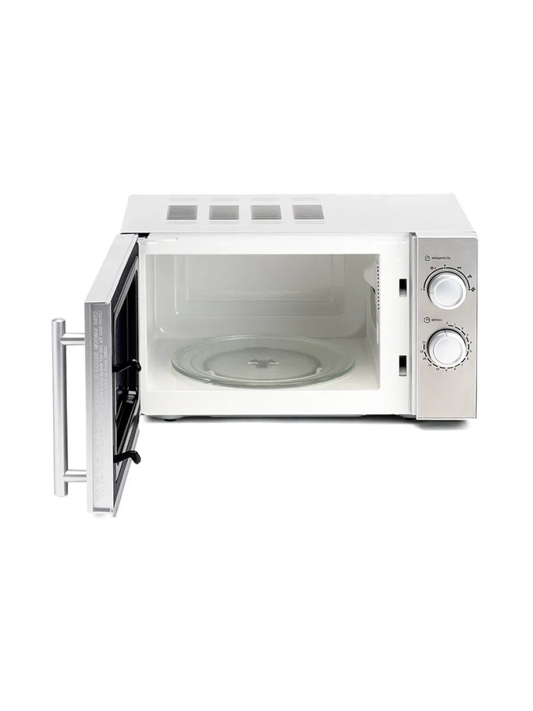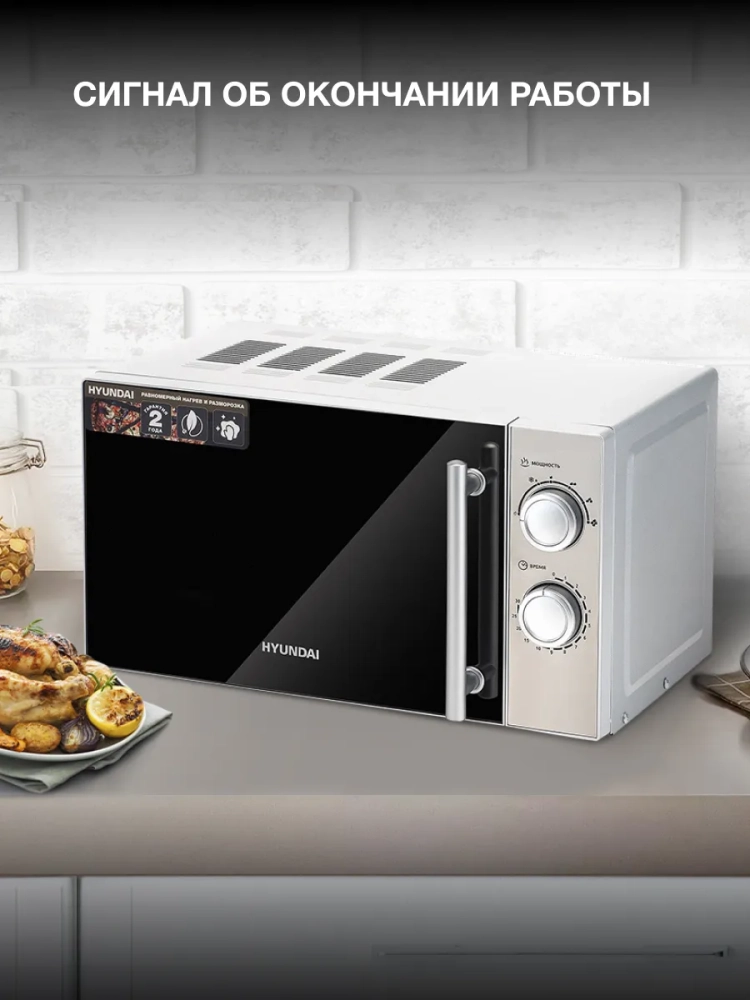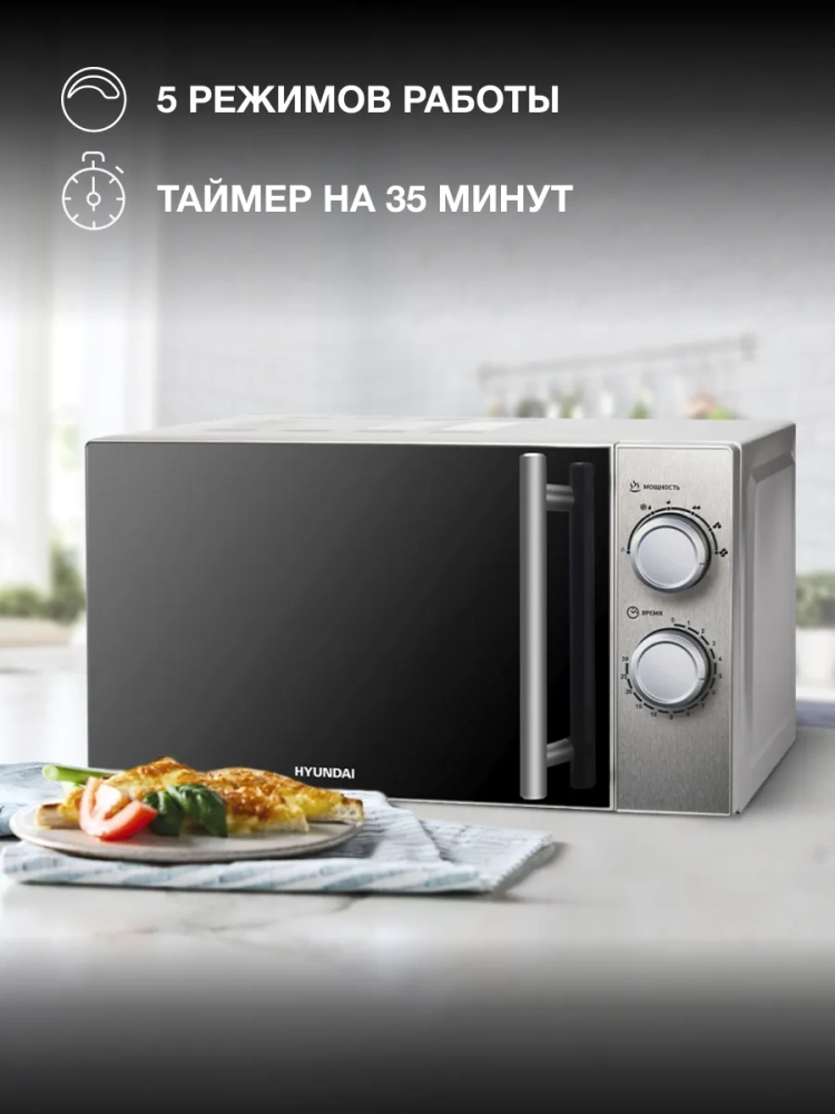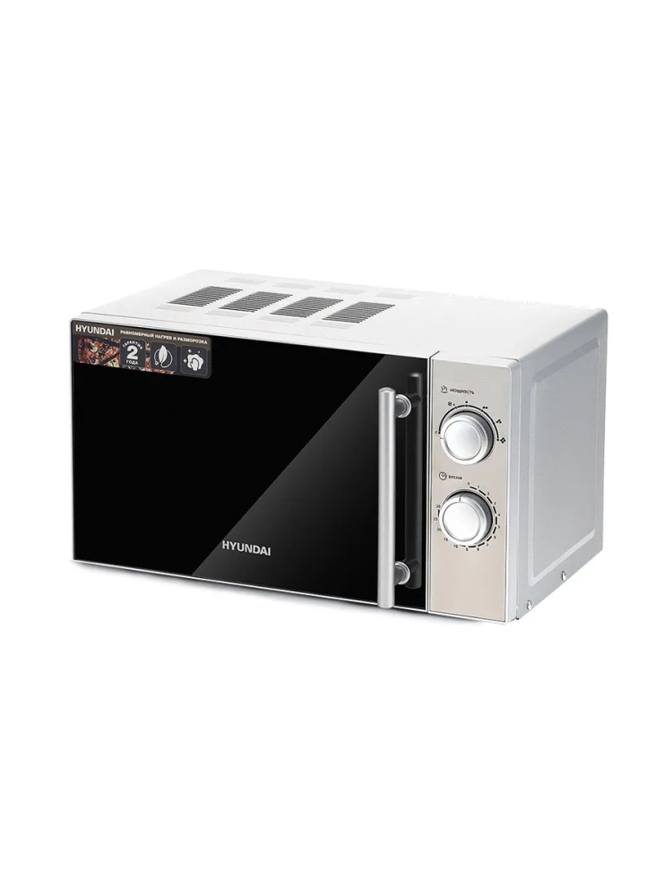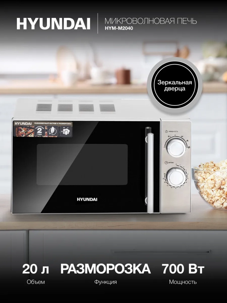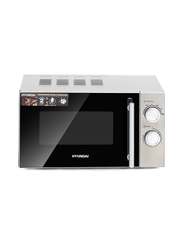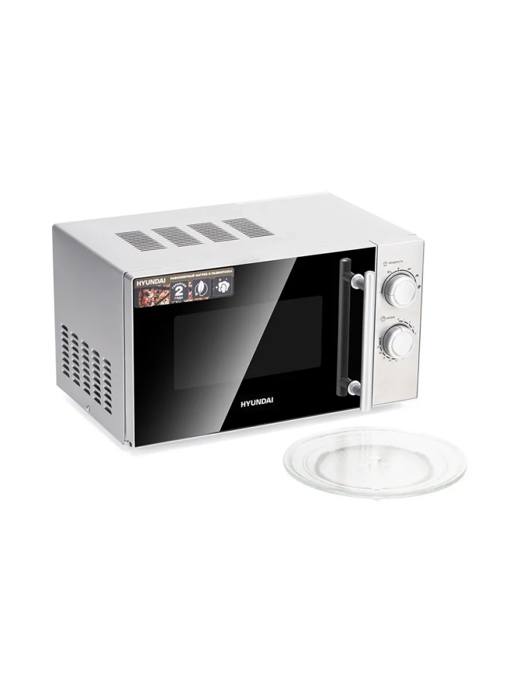 СВЧ Hyundai HYM-M2040 – модель, которая служит для разогревания уже готовой пищи и размораживания. Установить программу можно с помощью двух поворотных переключателей механического типа. Они задают нужную мощность и время. После окончания процесса звучит приятный сигнал. Уход за внутренней поверхностью не составляет особого труда, так как она выполнена из специальной эмали с гладкой фактурой. Корпус изготовлен из металла и окрашен в серебристый цвет. Дверца открывается при помощи ручки, имеет затемненную зеркальную поверхность. Хромированные ручка и регуляторы являются акцентами. Внешний вид достаточно стильный, хорошо впишется в любой интерьер. Благодаря компактным размерам модель не займет много места при размещении. Прорезиненные ножки обеспечивают устойчивость на любом покрытии. Рекомендуется устанавливать на столешнице и оставлять свободными для доступа воздуха вентиляционные отверстия.