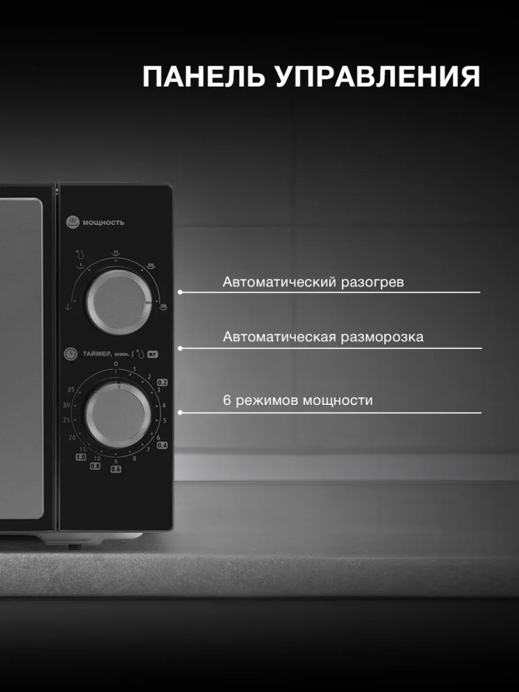Простое механическое управление. Микроволновая печь оснащена двумя круглыми регуляторами. С помощью верхнего выбирайте нужный уровень мощности, с помощью нижнего – время приготовления. Дверца микроволновки открывается за ручку, что делает устройство надежным и удобным в эксплуатации.