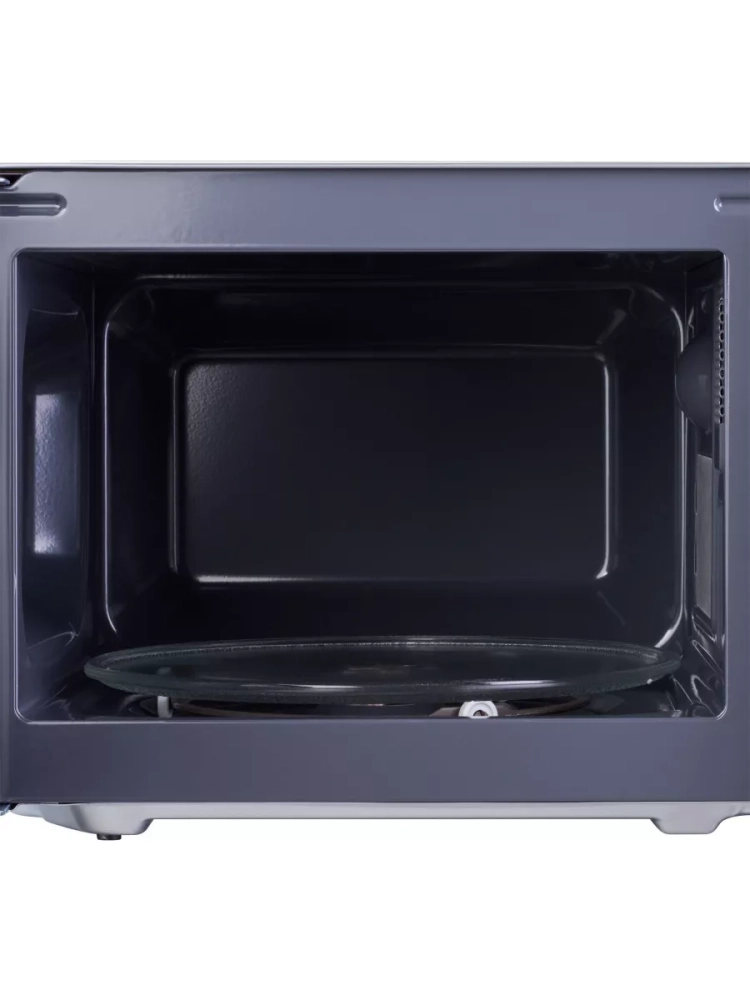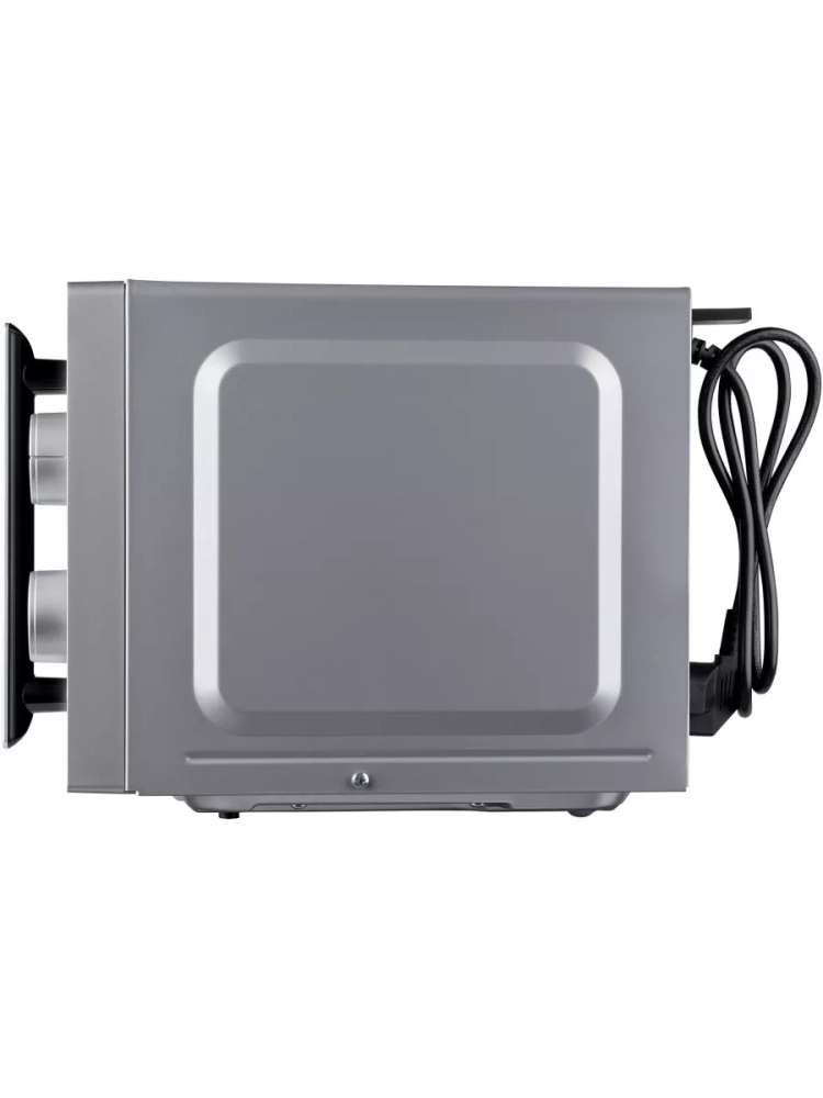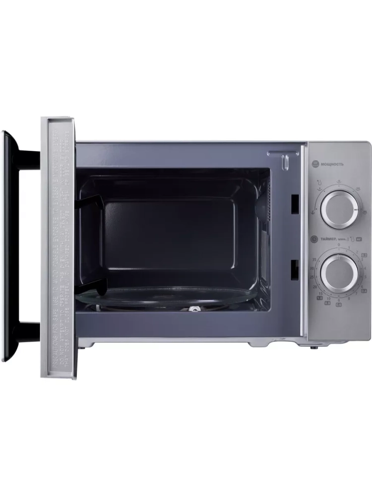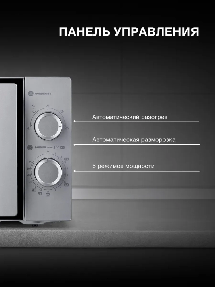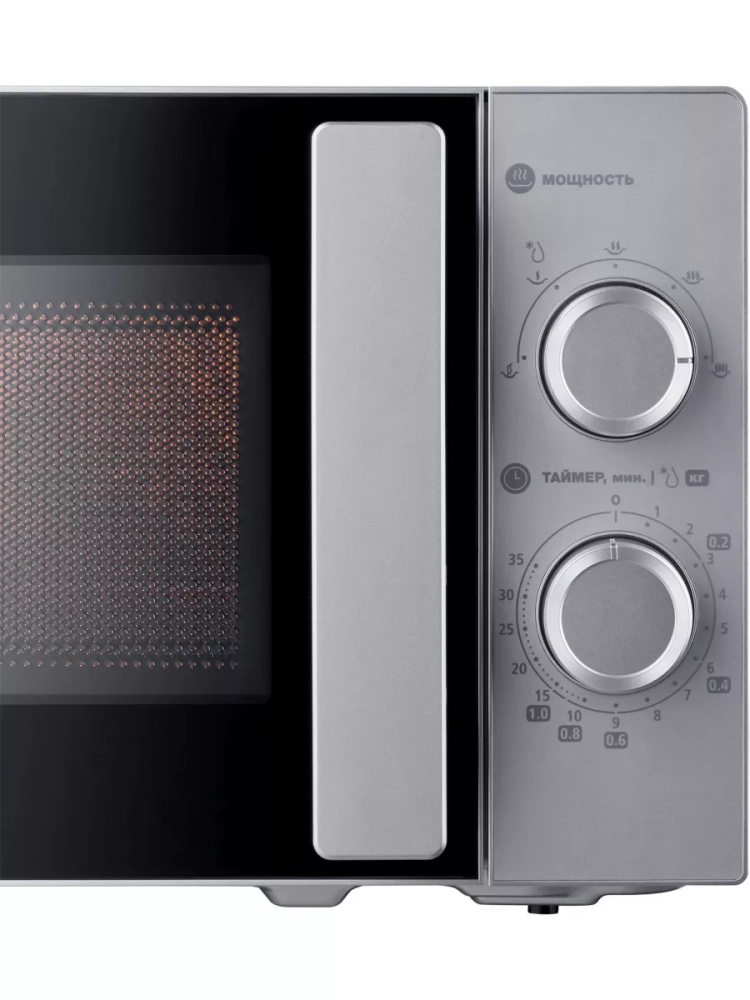 Простое механическое управление. Микроволновая печь оснащена двумя круглыми регуляторами. С помощью верхнего выбирайте нужный уровень мощности, с помощью нижнего – время приготовления. Дверца микроволновки открывается за ручку, что делает устройство надежным и удобным в эксплуатации.