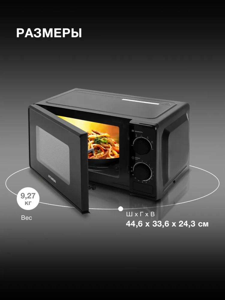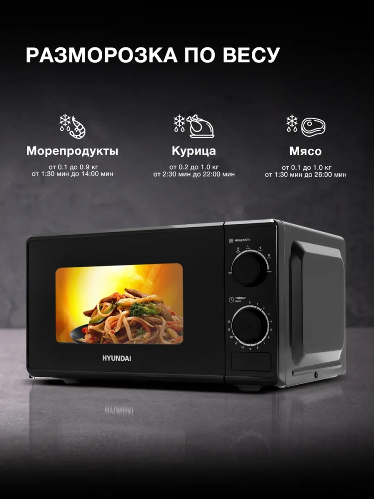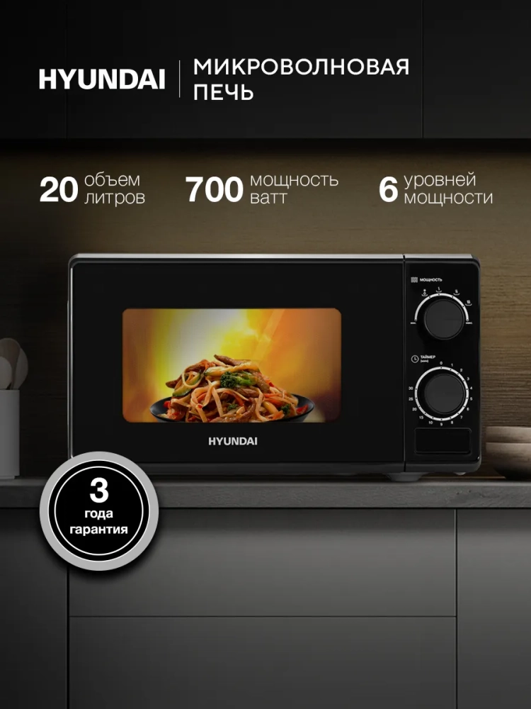 Микроволновая печь Hyundai HYM-M2096 — это надёжный и лаконичный прибор, который впишется в любую кухню и станет незаменимым помощником в повседневной готовке. Благодаря классическому механическому управлению пользоваться этой моделью легко и удобно, а наличие 6 уровней мощности позволяет выбрать режим для быстрого разогрева и щадящей разморозки.