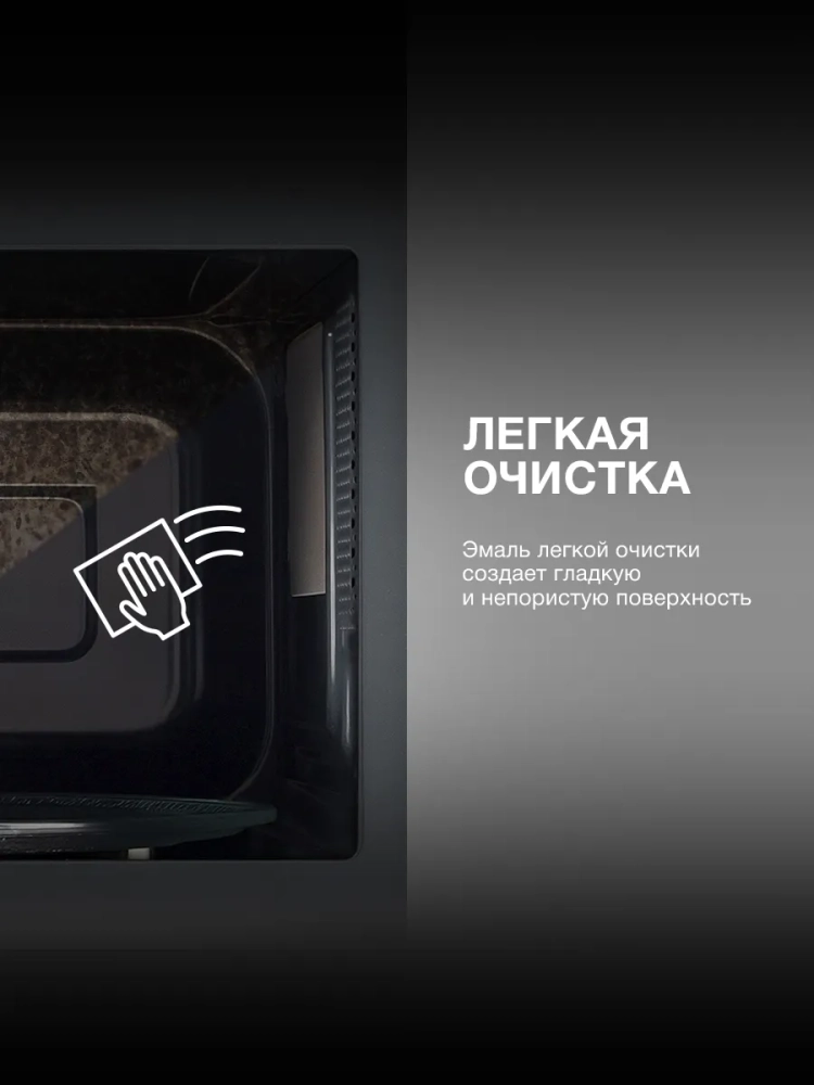Внутренняя камера покрыта прочной и гладкой эмалью лёгкой очистки — она не впитывает запахи, устойчива к загрязнениям и не требует особых усилий при уходе. Просто протрите поверхность влажной салфеткой после использования — и печь снова готова к работе. Распределение микроволн в Hyundai HYM-M2096 устроено таким образом, чтобы прогрев происходил равномерно. Это исключает появление перегретых зон или холодных участков на тарелке.