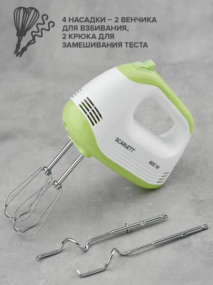 Среди множества кухонных приборов есть один, без которого не обходится ни одна хозяйка, - и это миксер. Приготовление соусов и кремов, суфле и джемов, начинок и теста для пирогов станет намного проще и быстрее, если использовать это устройство. Вы можете творить целый день, получая удовольствие от процесса и результата готовки. В комплект входят два венчика для взбивания яиц и крема, а также две насадки для смешивания теста. Меняя насадки и выбирая один из пяти скоростных режимов, вы без труда приготовите идеальное тесто или крем. У вас будет возможность в точности следовать рецепту, чтобы получить именно то, что необходимо.