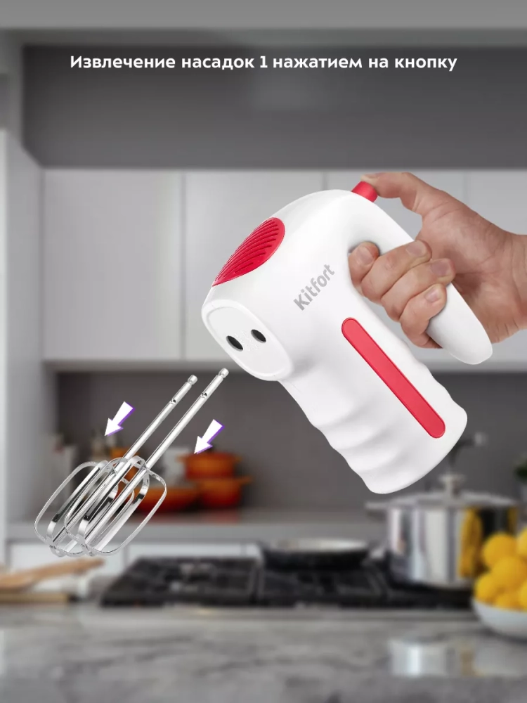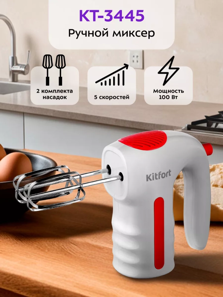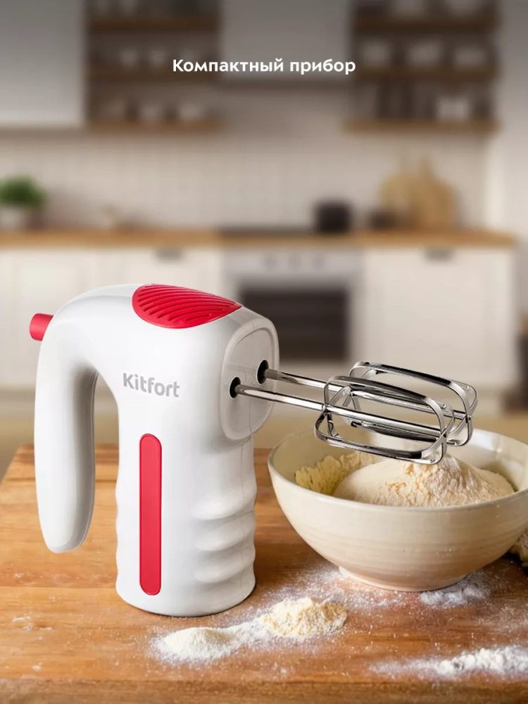 Ручной миксер Kitfort КТ-3445 поможет вам взбить яичные белки, приготовить кремы, домашние соусы, а также жидкое тесто, например, для шарлотки, или густое — для сдобной выпечки. Миксер подходит для замешивания легких и плотных смесей, но не для замеса тугого теста как, например, для пельменей.