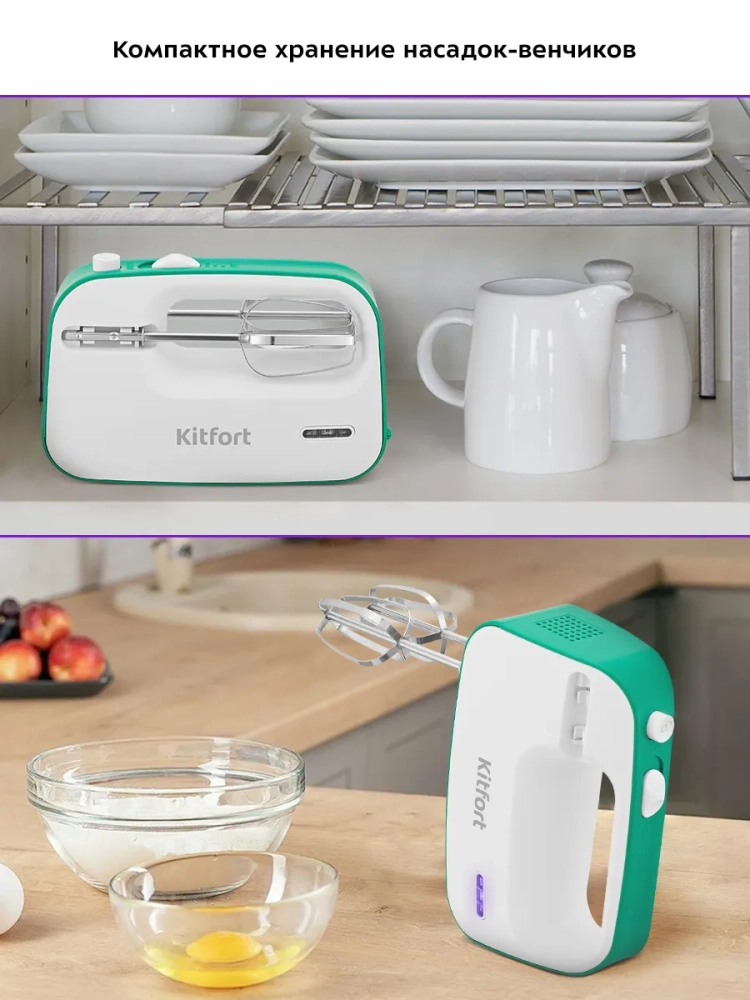 Прибор оснащен одним комплектом насадок: венчиками для взбивания ингредиентов и замеса жидкого теста для блинов, вафель или бисквитов. Насадки легко снимаются с моторного блока, поэтому уход за устройством не составит труда. Для удобства у миксера есть специальная кнопка для снятия насадок. Также на корпусе есть держатели насадок для компактного и удобного хранения устройства.