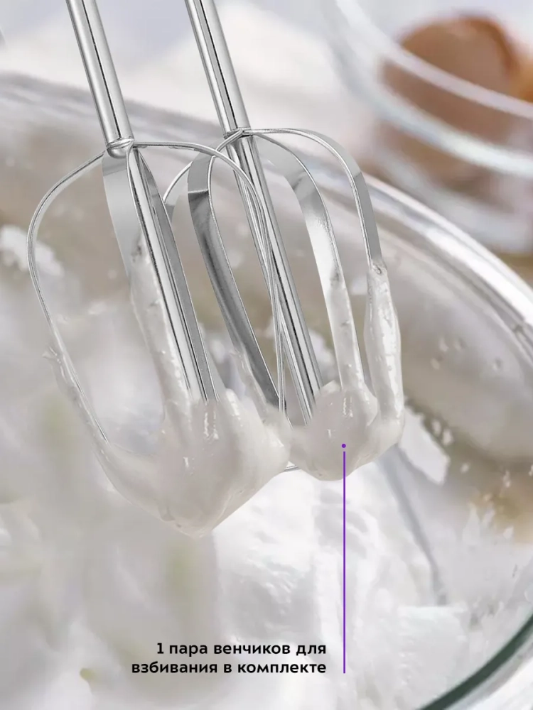 Прибор оснащен одним комплектом насадок: венчиками для взбивания ингредиентов и замеса жидкого теста для блинов, вафель или бисквитов. Насадки легко снимаются с моторного блока, поэтому уход за устройством не составит труда. Для удобства у миксера есть специальная кнопка для снятия насадок. Также на корпусе есть держатели насадок для компактного и удобного хранения устройства.