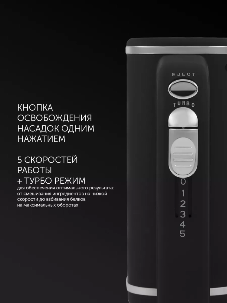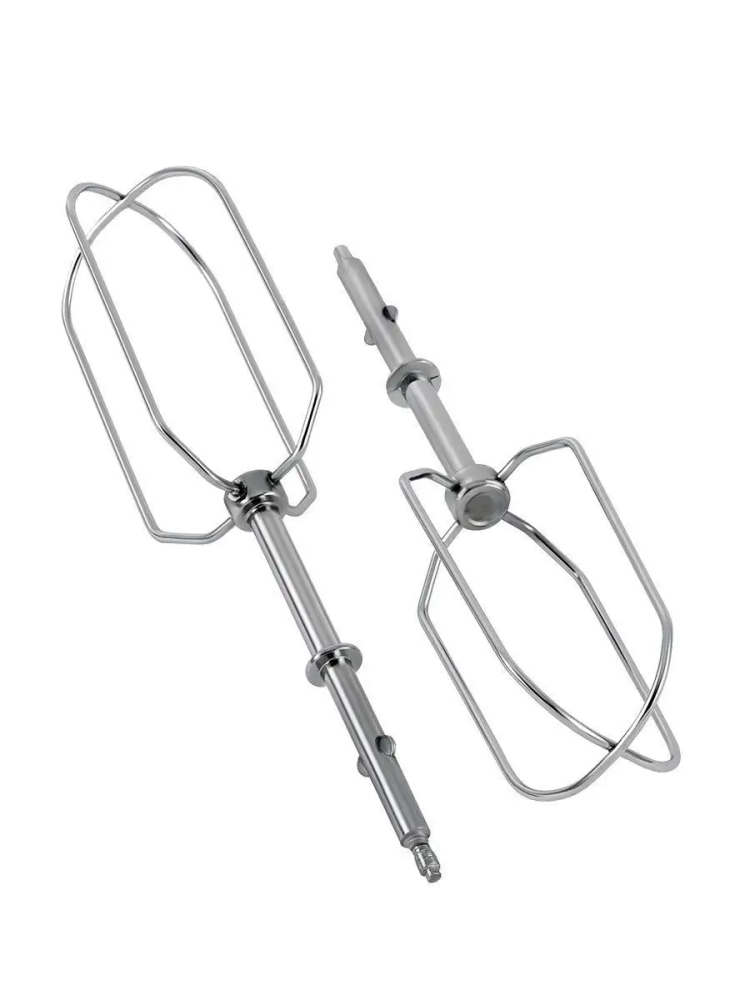 В набор входят два венчика для взбивания и два крюка для замеса теста. Благодаря кнопке быстрого снятия насадок вам не придется пачкать руки — достаточно нажать кнопку, и насадки сами выскользнут в раковину или подставленную миску.