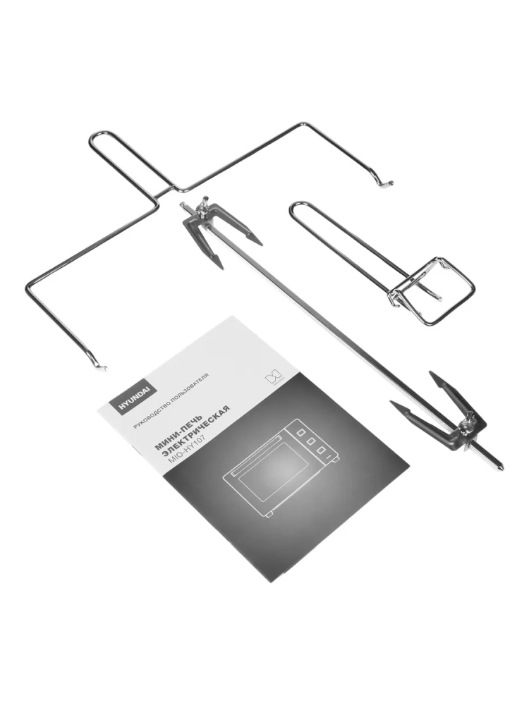 В комплекте идут эмалированный противень, решетка-гриль, поддон для сбора крошек и масла, а также ухваты для безопасного извлечения аксессуаров и комплект для вертела.
