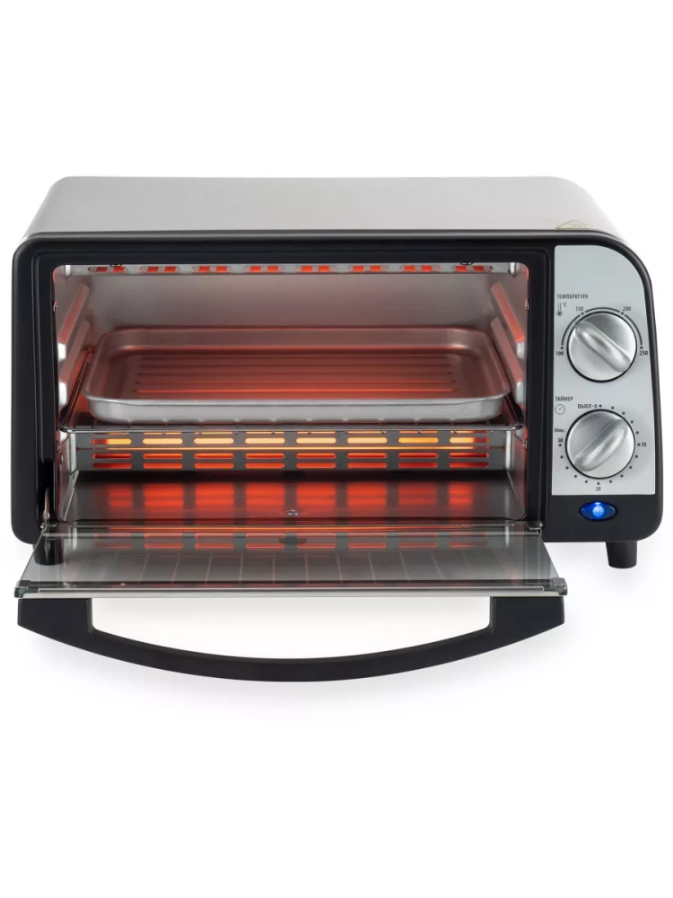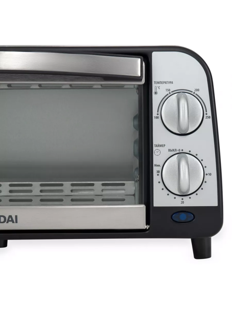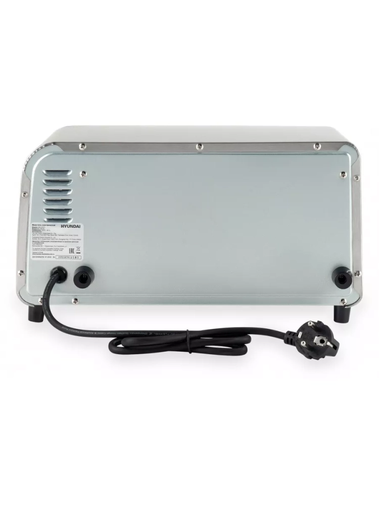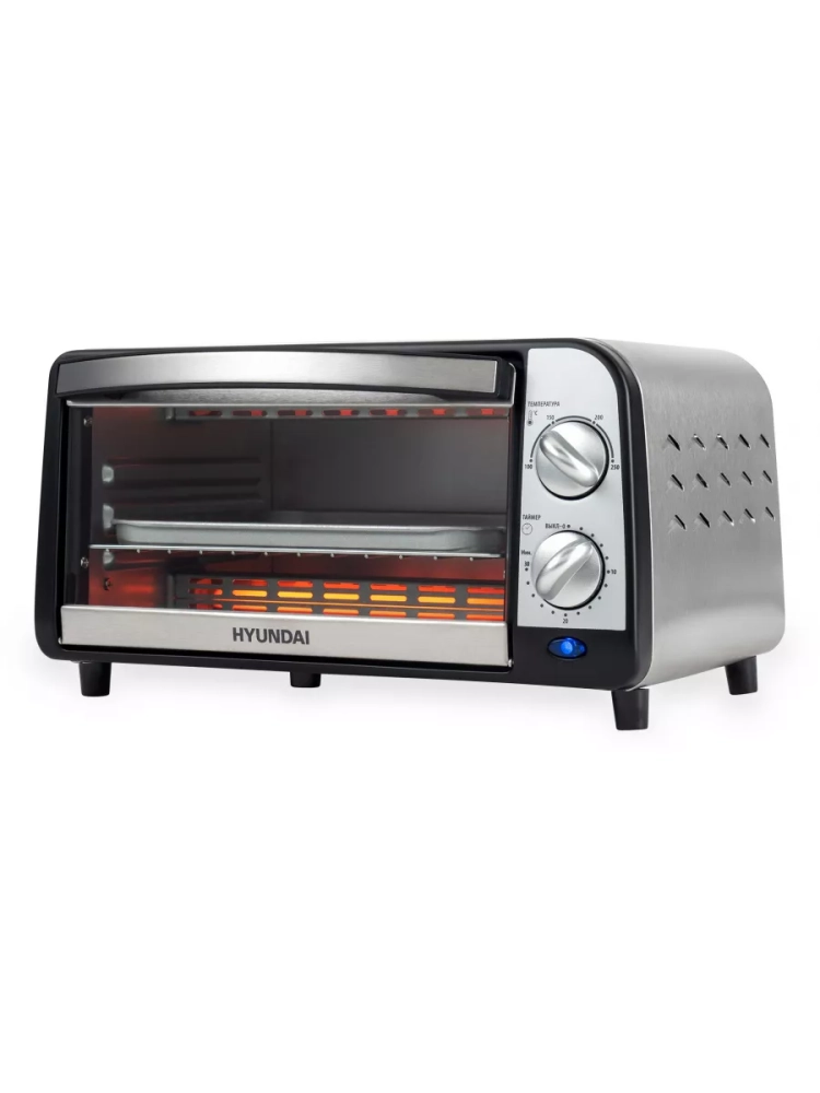 Мини-печь Hyundai MIO-HY071 серебристый/черный, мощность 800Вт, объем духовки 9л., механическое управление, температура терморегулятора -250 С. Корпус, а так же верхняя и нижняя часть панели изготоговлены из нержавеющей стали. размеры противня 241.7x187x15
