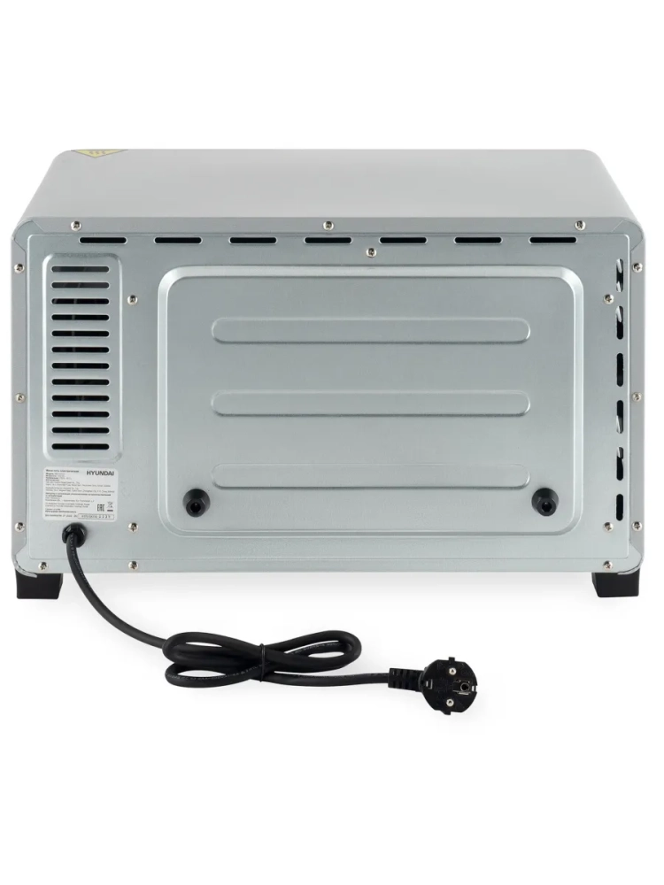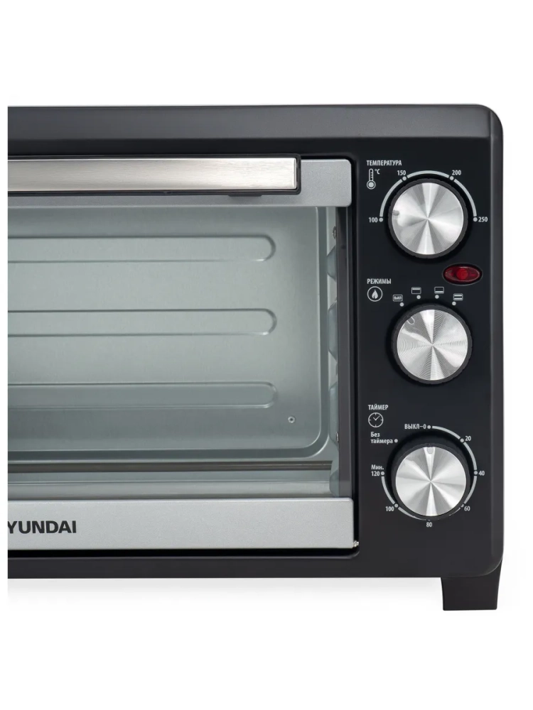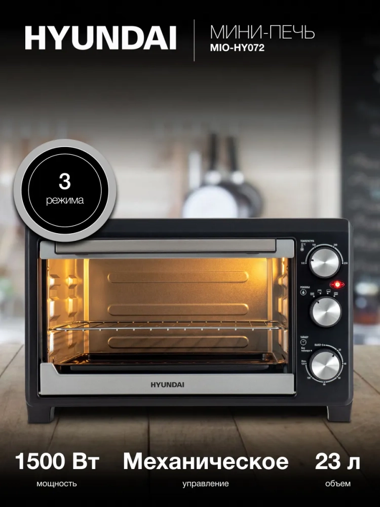 Мини-печь Hyundai MIO-HY072 серебристый/черный, мощность 1500Вт, объем духовки 23л., механическое управление, температура терморегулятора 100С-250С.