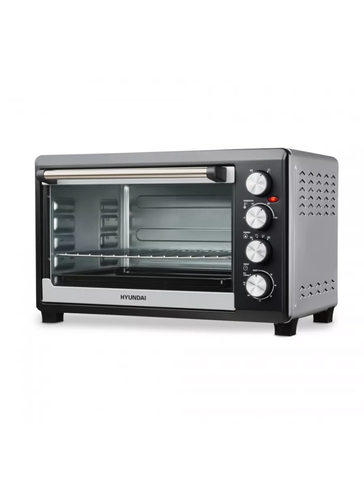 Мини-печь Hyundai MIO-HY075 серебристый/черный, мощность 2000Вт, объем духовки 38л., механическое управление, температура терморегулятора -250 С, размеры противня391.8x307x20.5