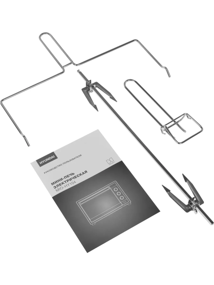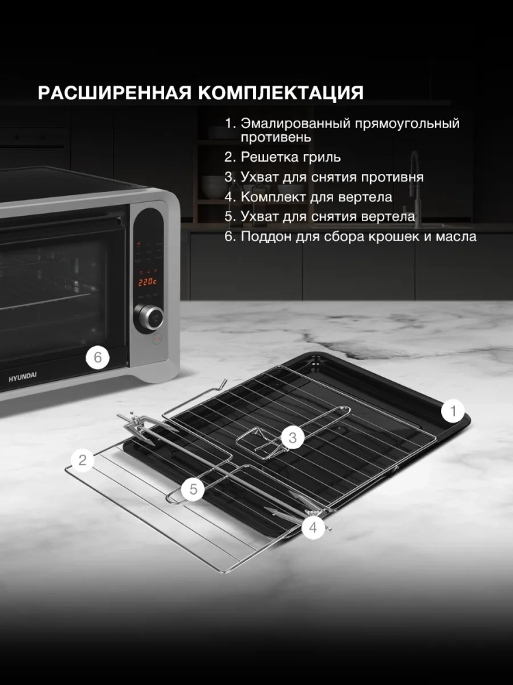 Мини-печь Hyundai MIO-HY104 поставляется с полной комплектацией: эмалированный прямоугольный противень, решетка гриль, комплект для вертела, ухваты для безопасного извлечения аксессуаров и удобный поддон для сбора крошек и масла. Все это упаковано в компактный корпус размерами 53,6 x 39,7 x 33,5 см, который легко впишется в кухню.