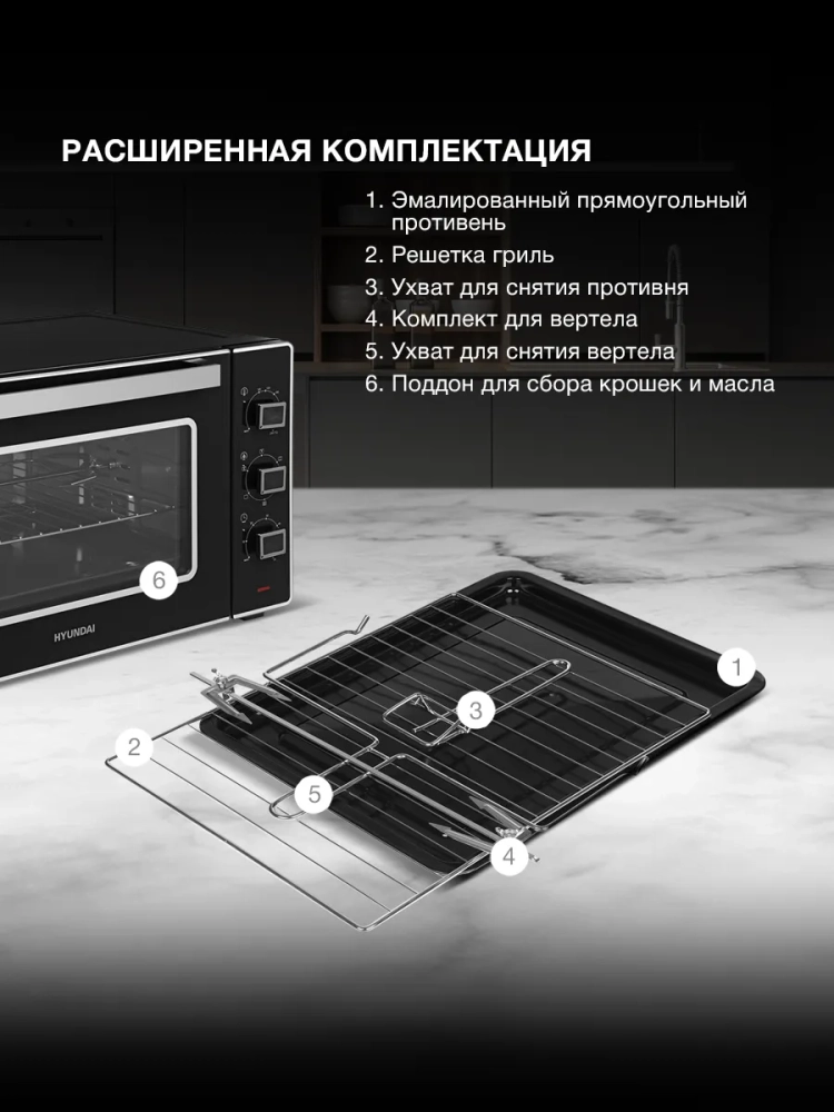 Мини-печь Hyundai MIO-HY107 — это удобное и функциональное решение для кухни, объединяющее в себе компактность и возможности полноценной духовки. Объем камеры составляет 45 литров, благодаря чему устройство отлично подходит для запекания, жарки и выпечки блюд для всей семьи.