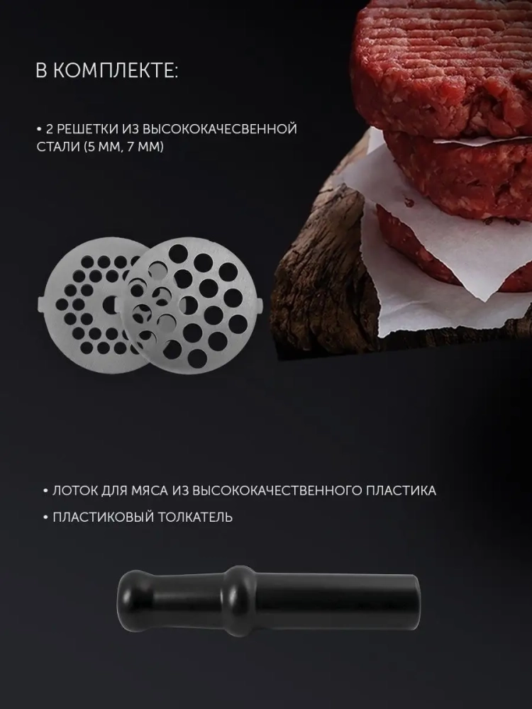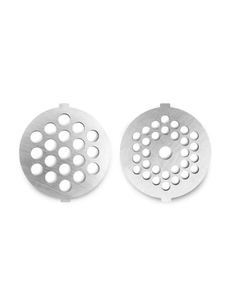 Два круглых диска из нержавеющей стали (5 мм и 7 мм) для обработки мяса разной жесткости.